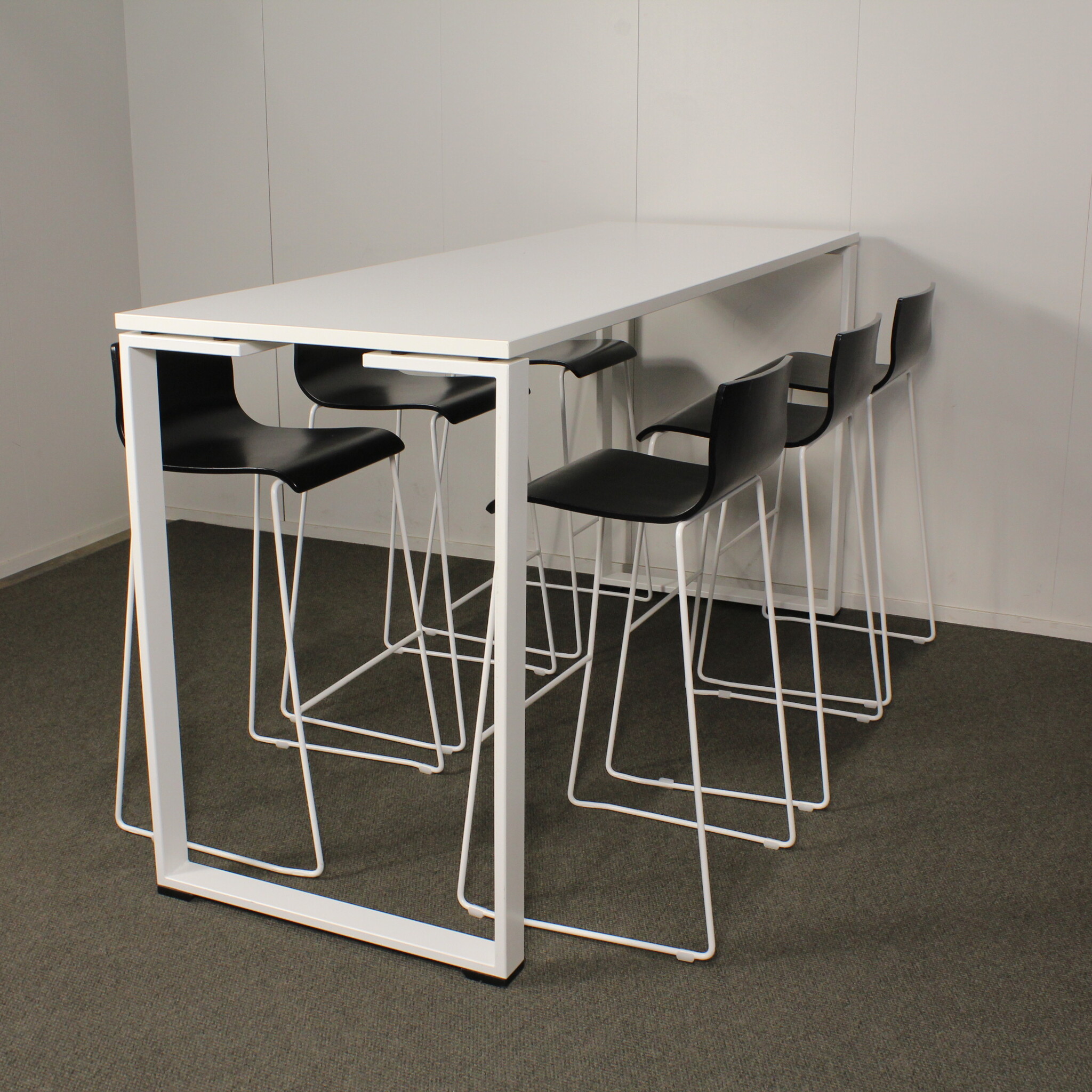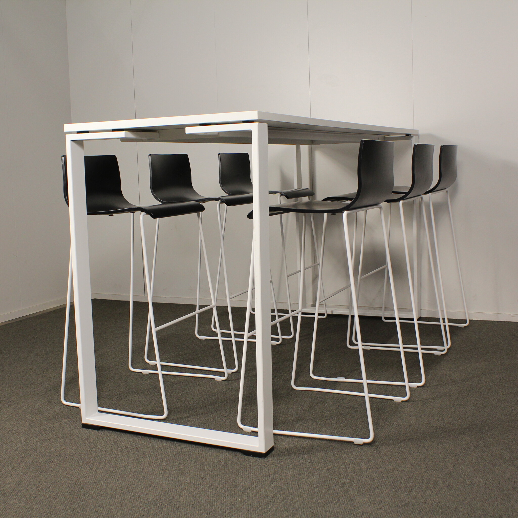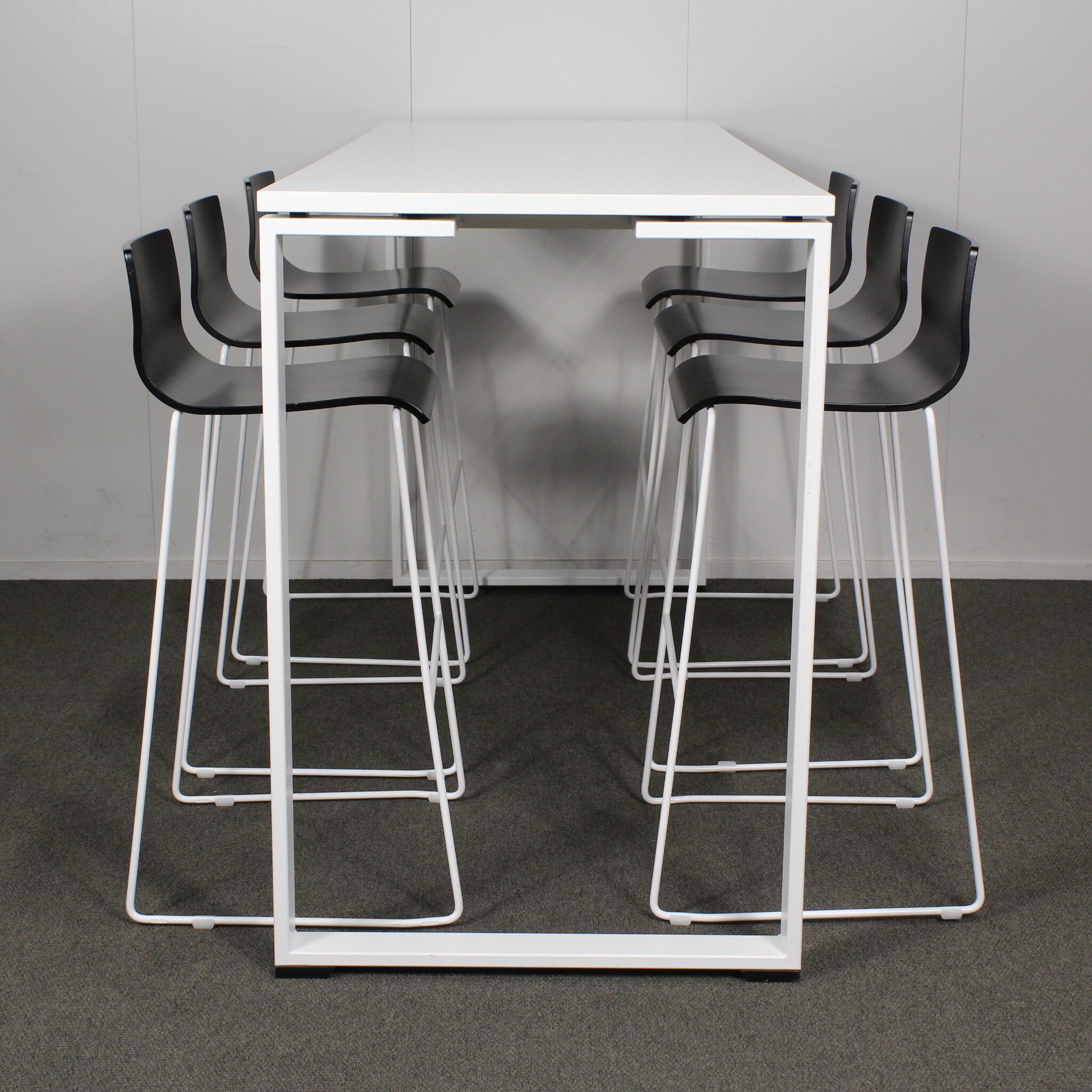 Tyylikäs pöytäryhmä kuudelle, sisältää tukevan pystypöydän ja kuusi siistiä jakkaraa.