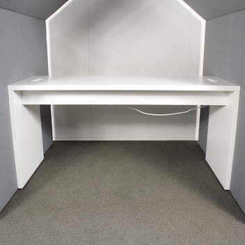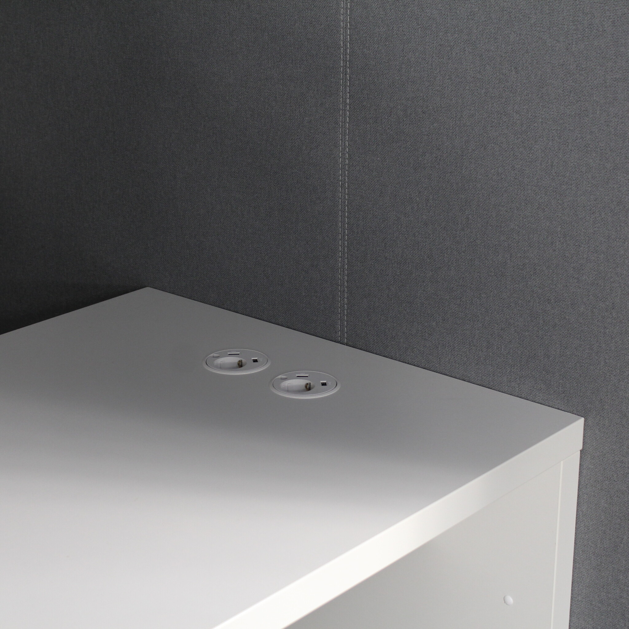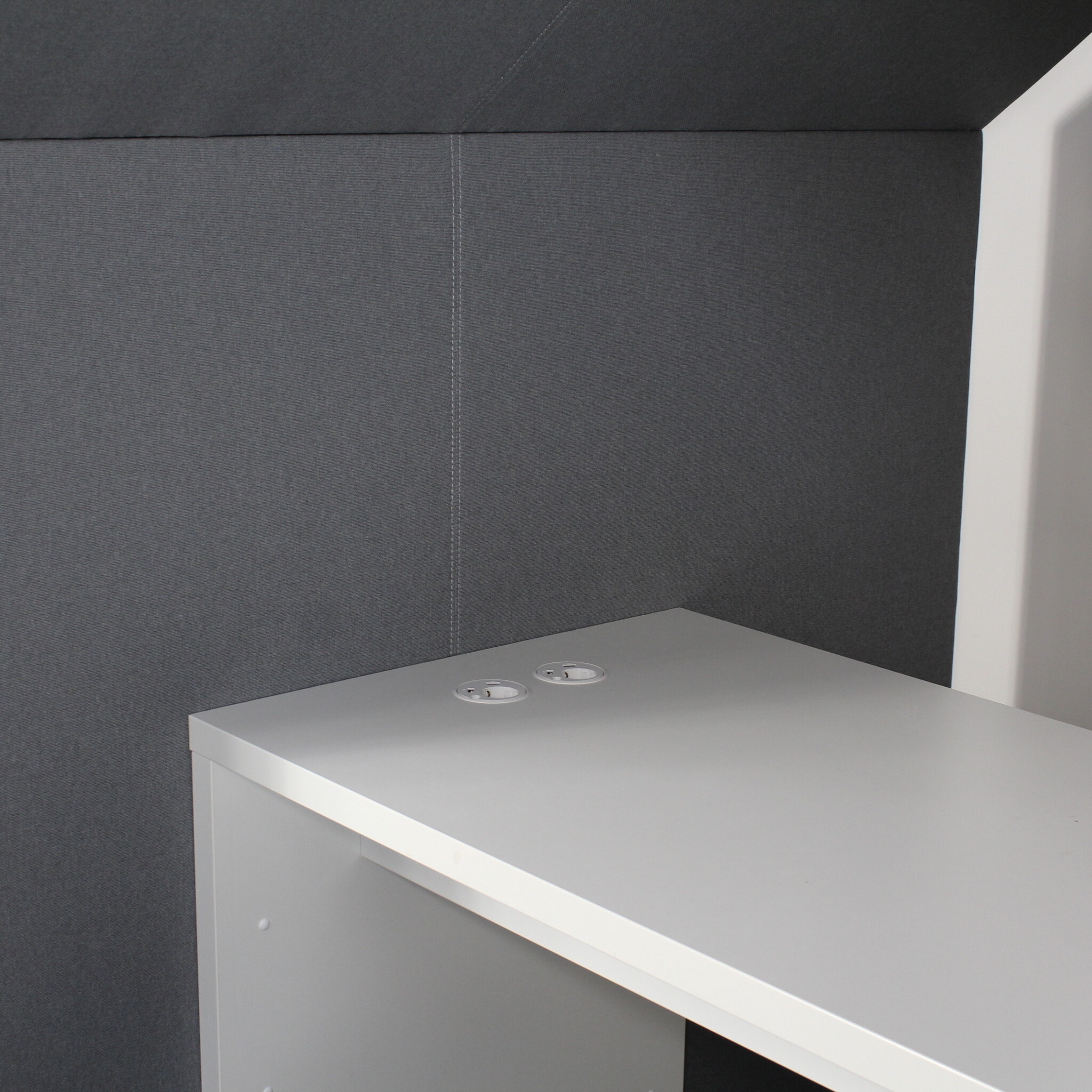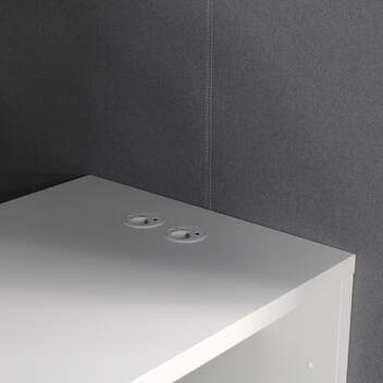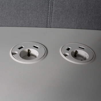 Verhoiluosat harmaa, valkoinen pöytä, pöydässä schuko + 2 x USB liitännät