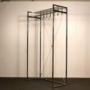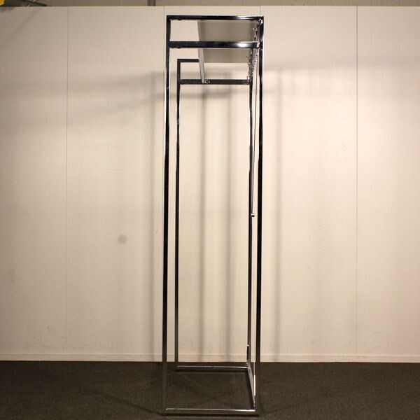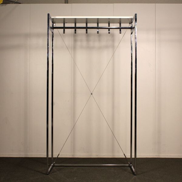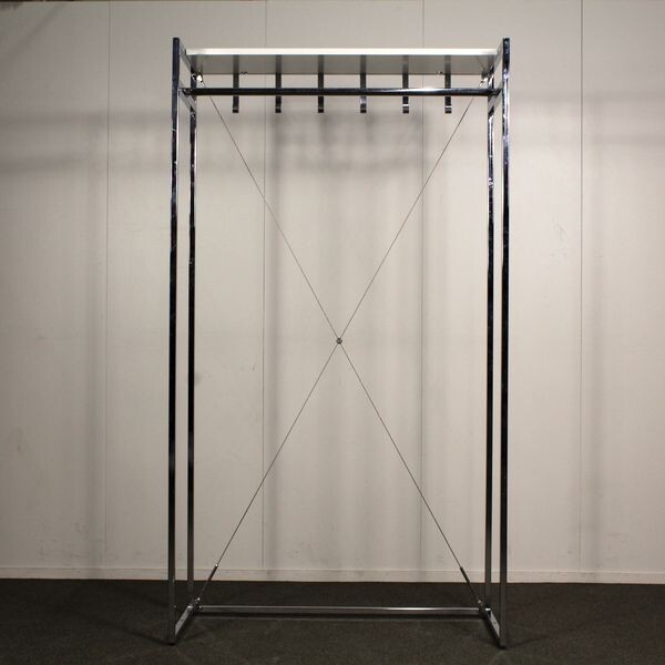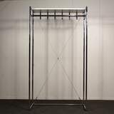 Leveys 100 cm, syvyys 44 cm, korkeus 180 cm. Rungon väri kromi, hattuhylly valkoinen.