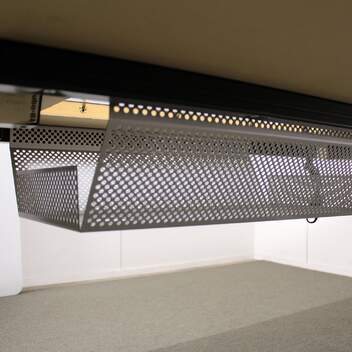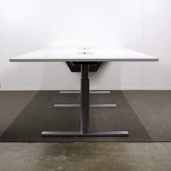 Leveys 300 cm, syvyys 120 cm. Kansi valkoinen, jalusta harmaa. Sisältää johtoluukut sekä johtokourut.