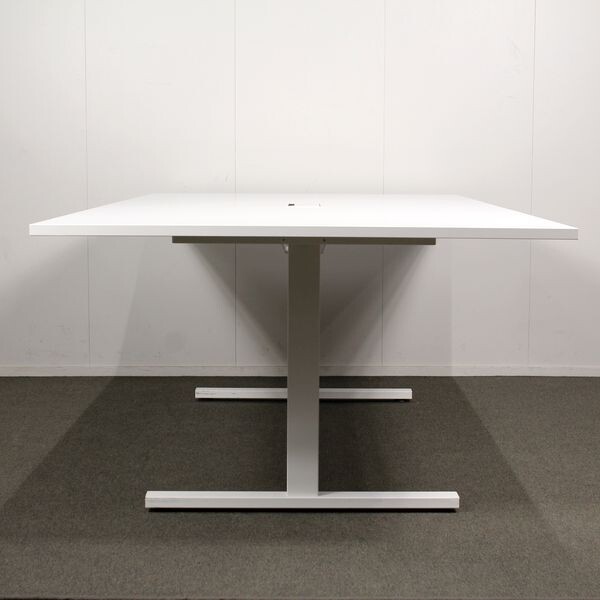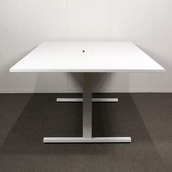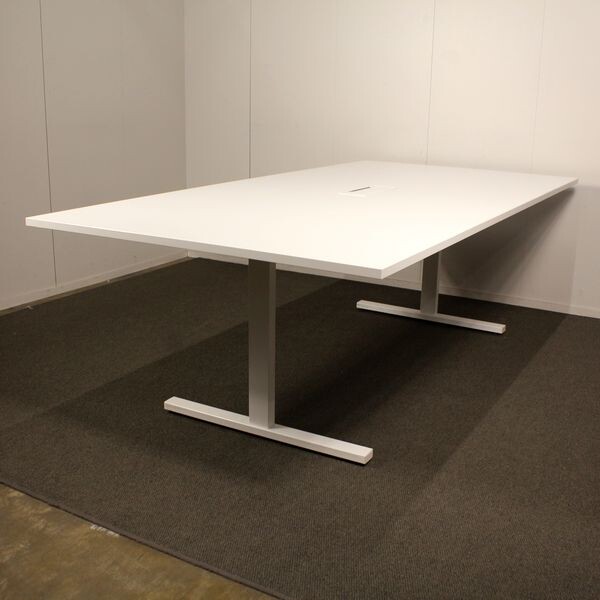 Käytetty T-Jalkainen Narbutas neuvottelupöytä, siistissä kunnossa. Tässä pöydässä on lisävarusteena näppärä johtoluukku ja uusi kansi