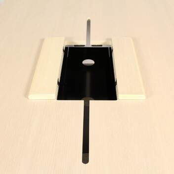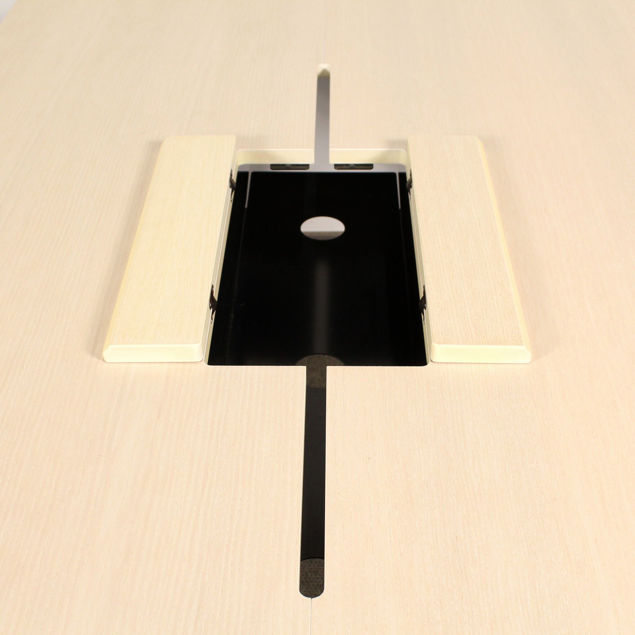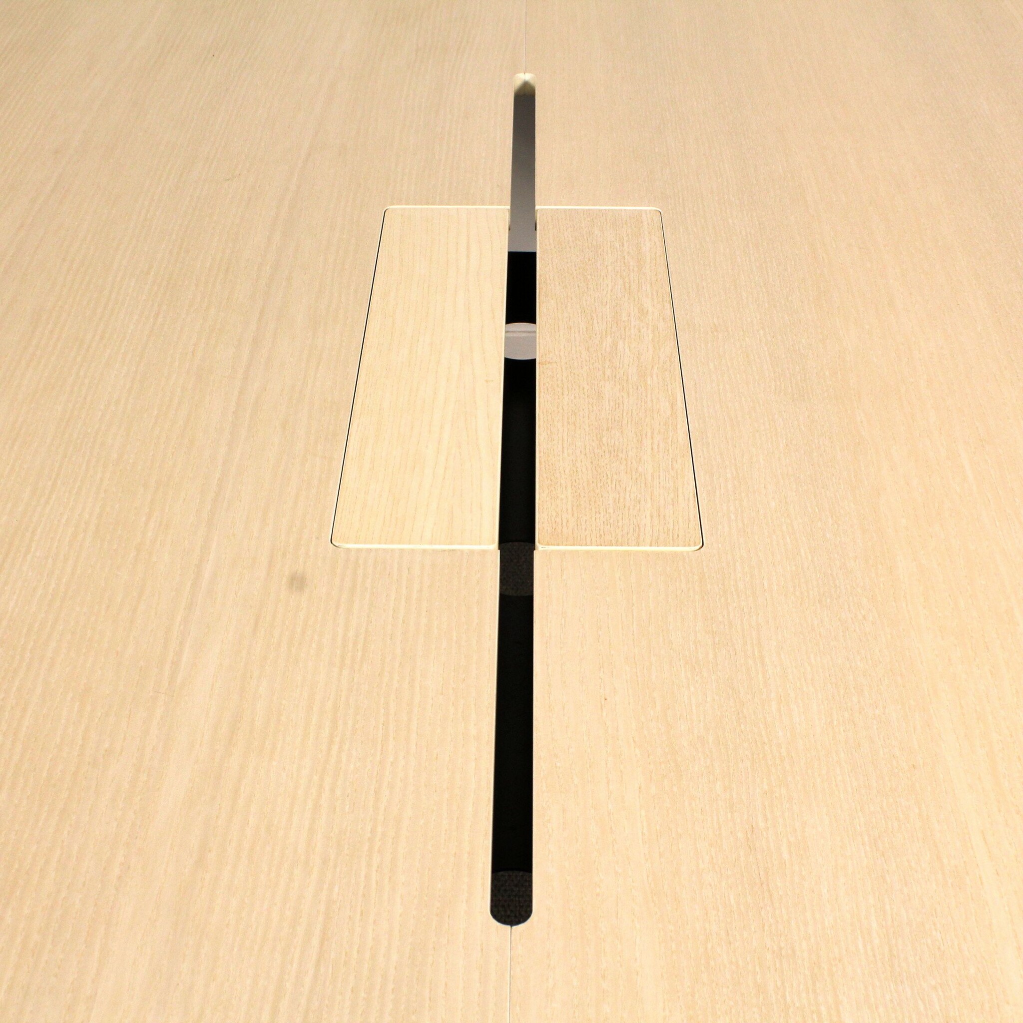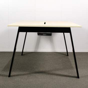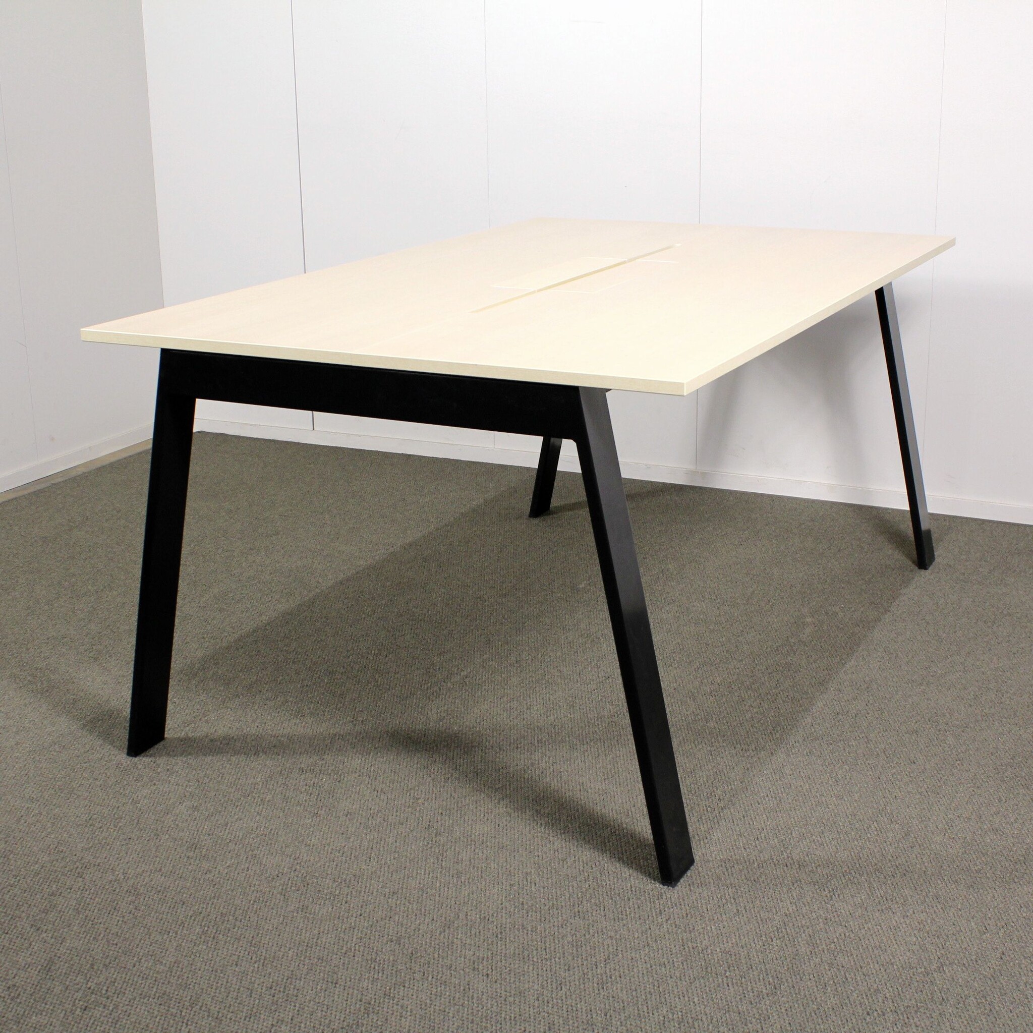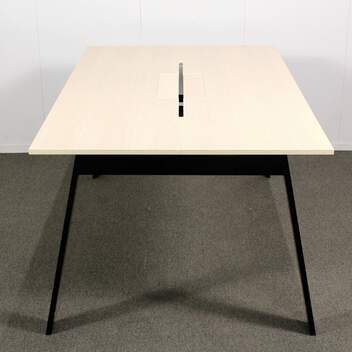Tyylikäs, käytetty neuvottelupöytä modernilla A-jalustalla. Pöytä on varustettu käytännöllisellä johtoluukulla sekä -kourulla.