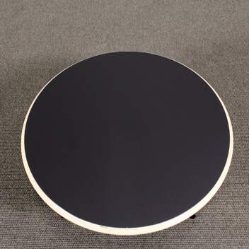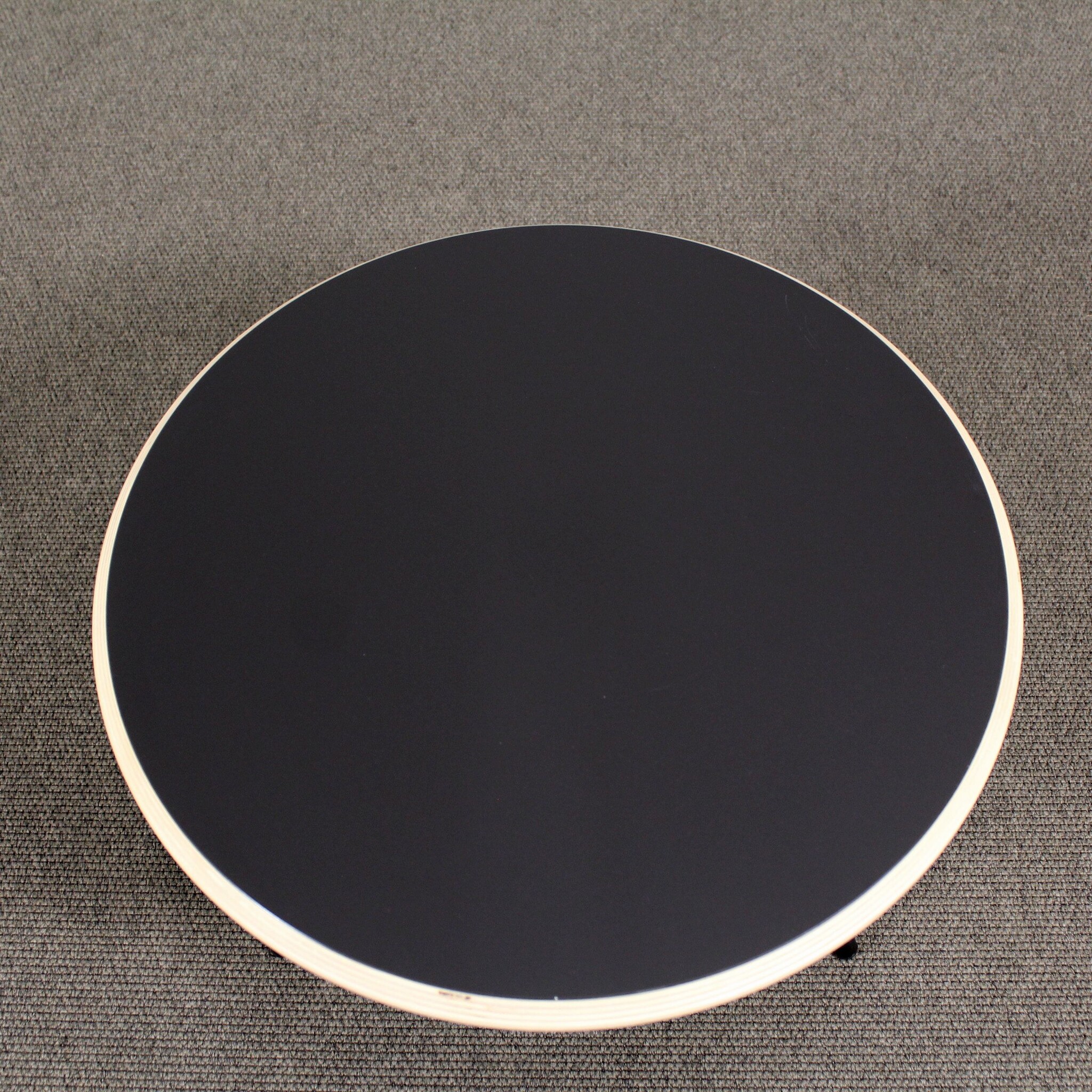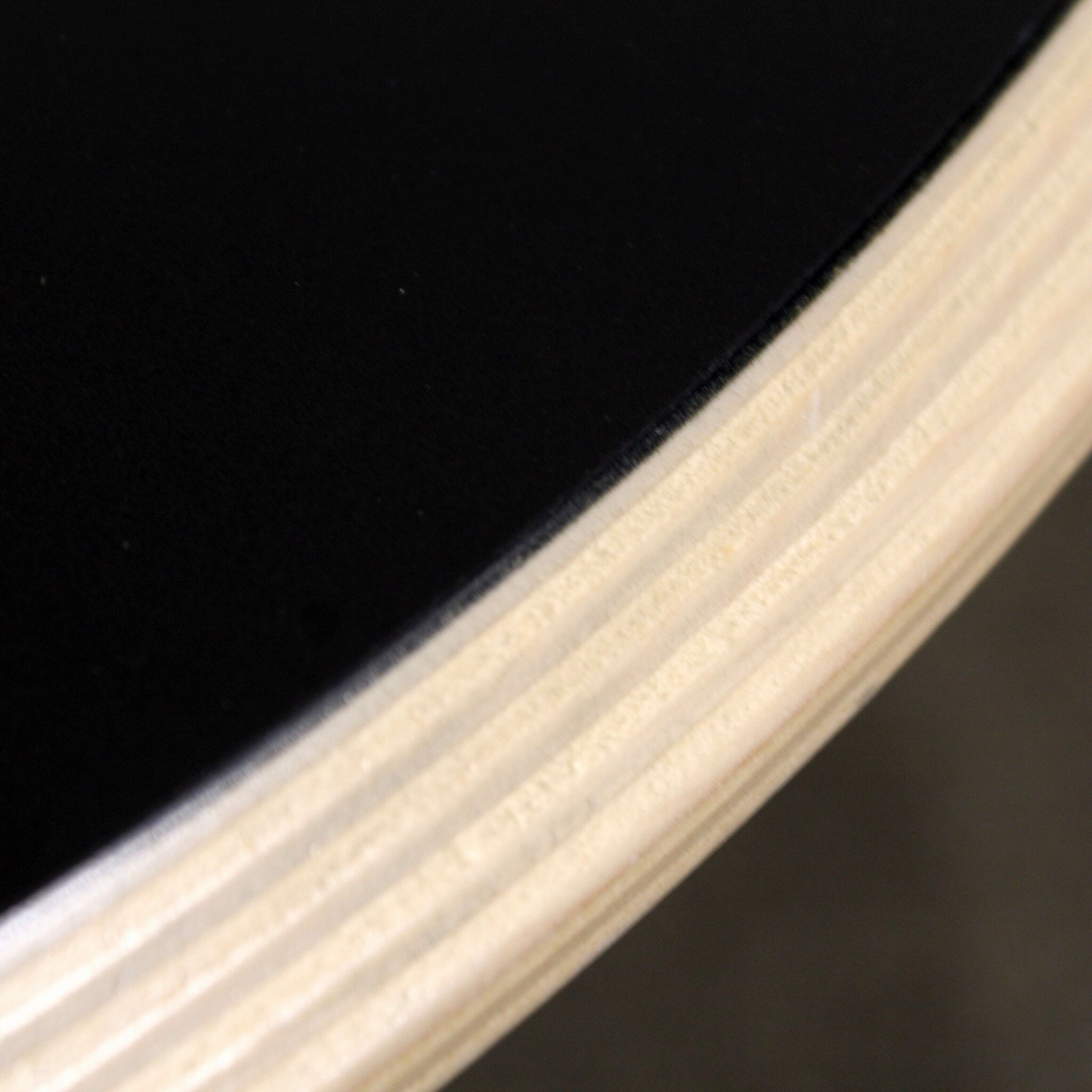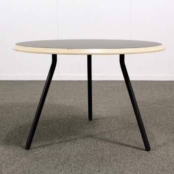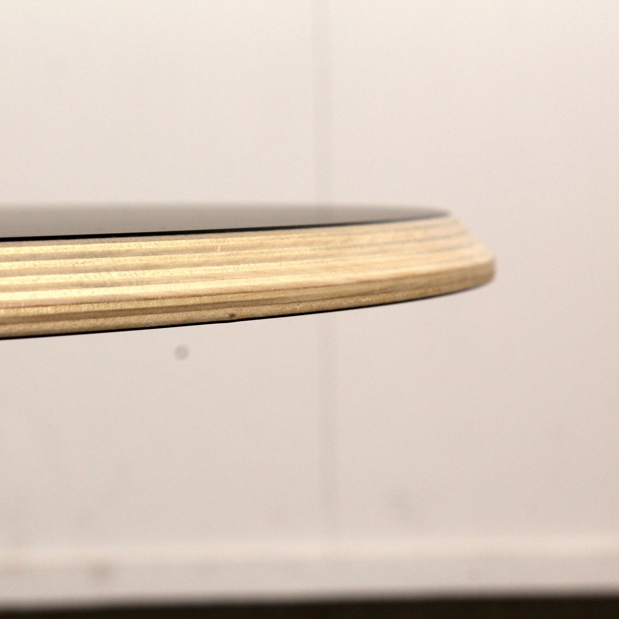Kannen halkaisija 60 cm, pöydän korkeus 40 cm. Kansi musta laminaatti, jalat pulverimaalattu musta metalli.