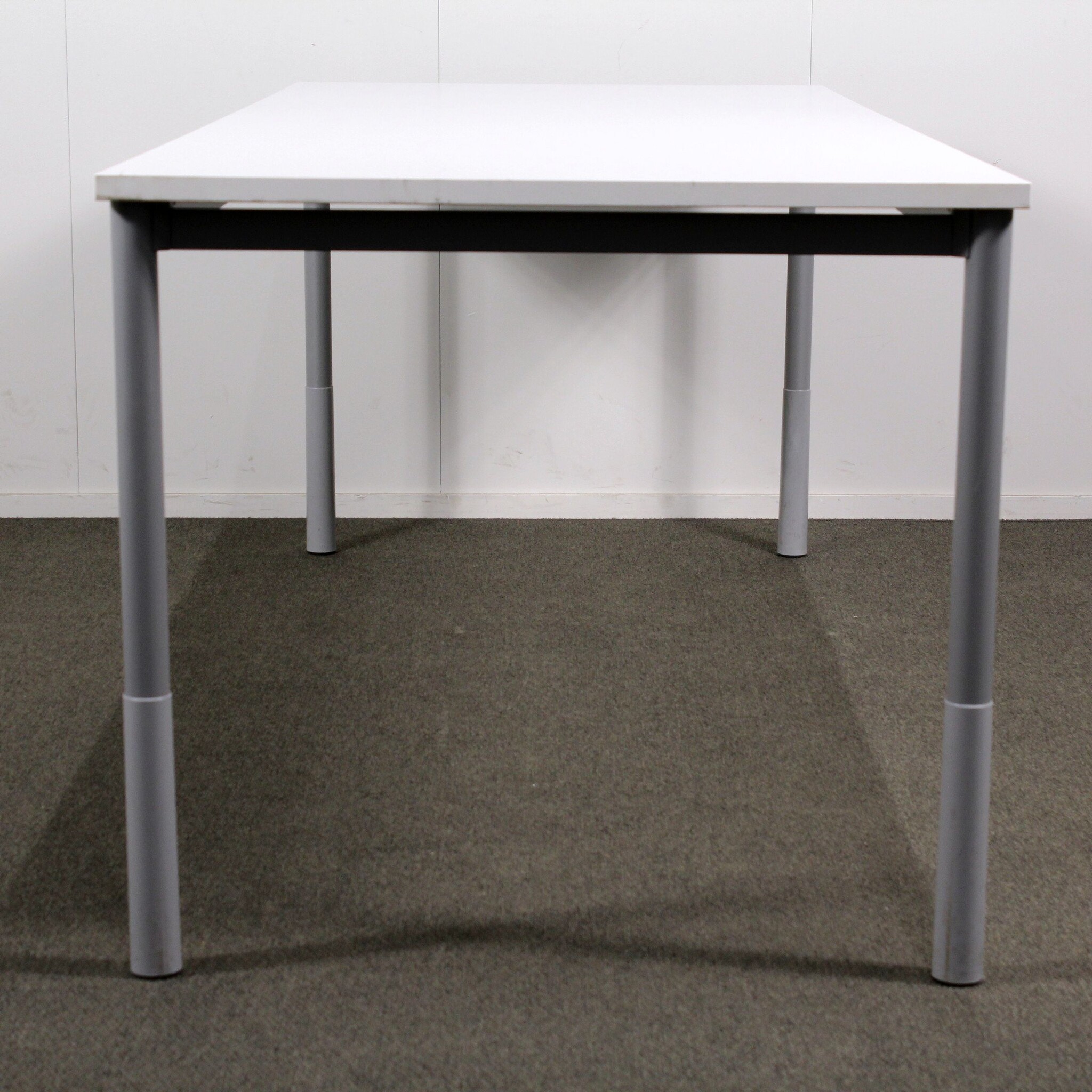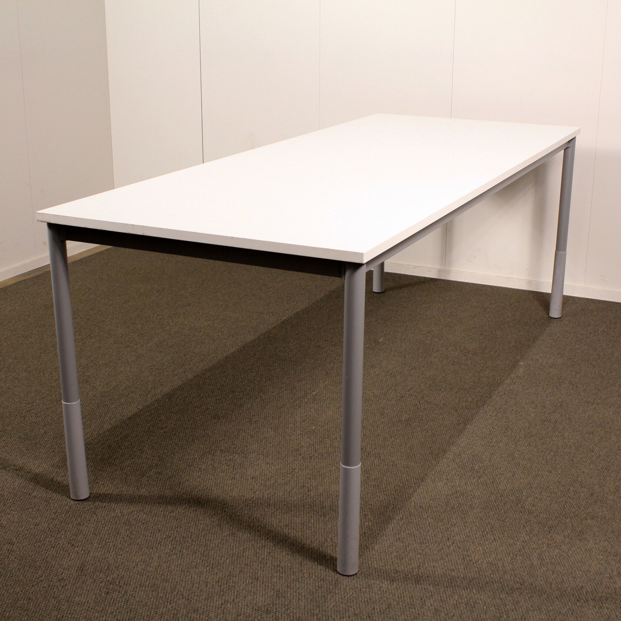 Hyväkuntoinen, käytetty Martela Pinta pöytä. Tässä pöydässä on korkeussäädettävät tolppajalat sekä siisti valkoinen laminaattikansi.