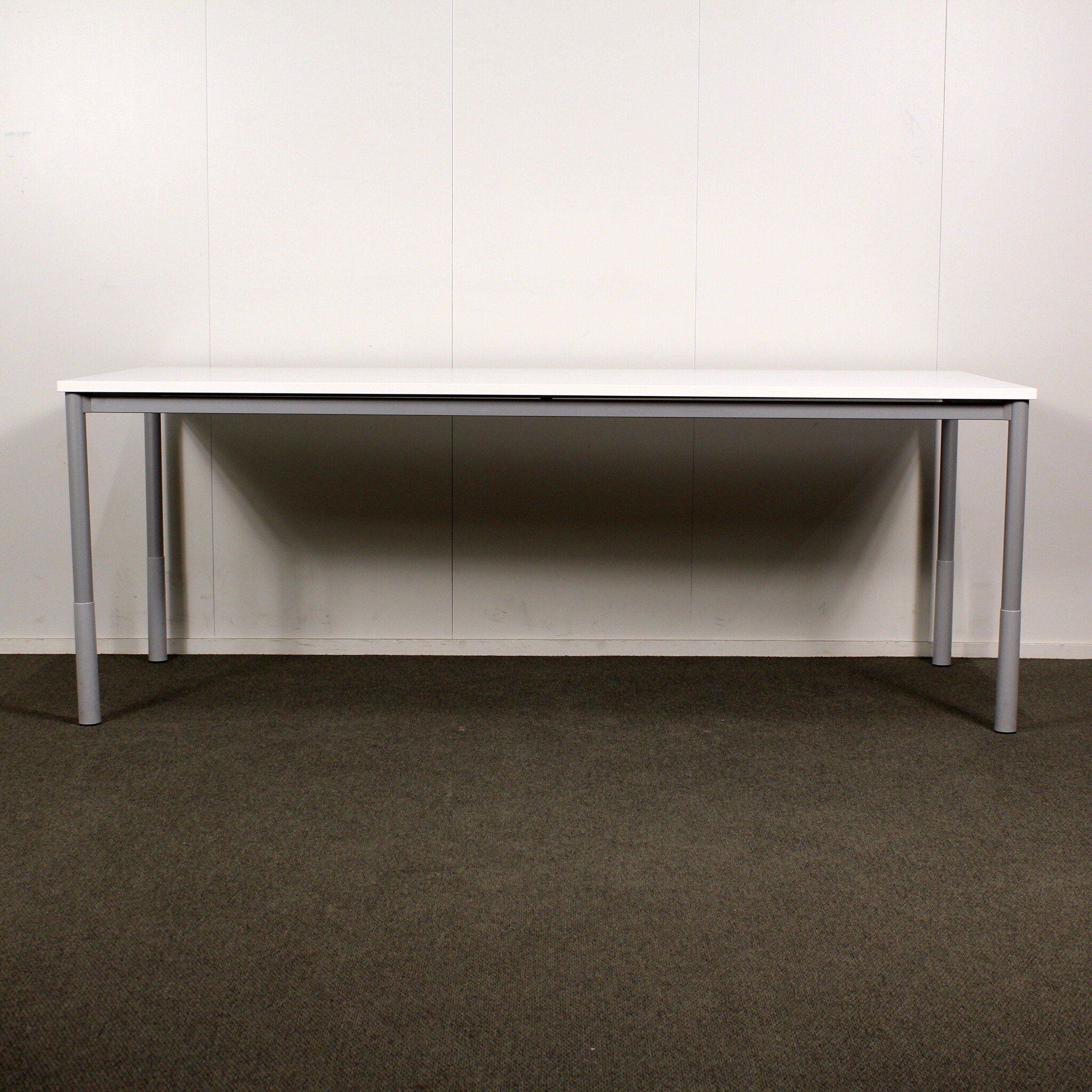 Kansi valkoinen laminaatti, leveys 200 cm, syvyys 80 cm. Jalusta pulverimaalattu harmaa.