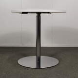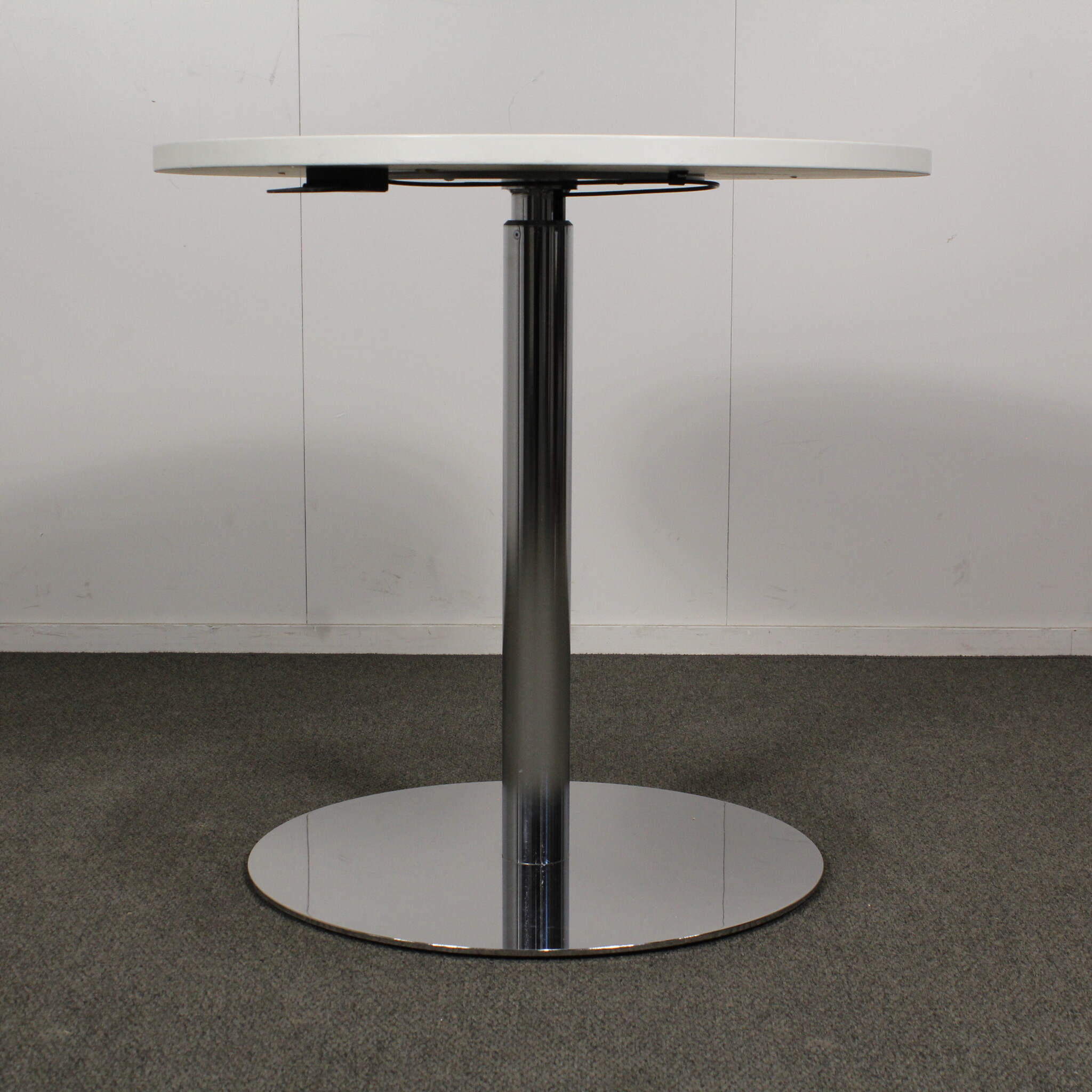 Korkeudensäätö 68 - 109 cm. Jalkaosa kromi, kansi valkoinen laminaatti. Kannen halkaisija 70 cm