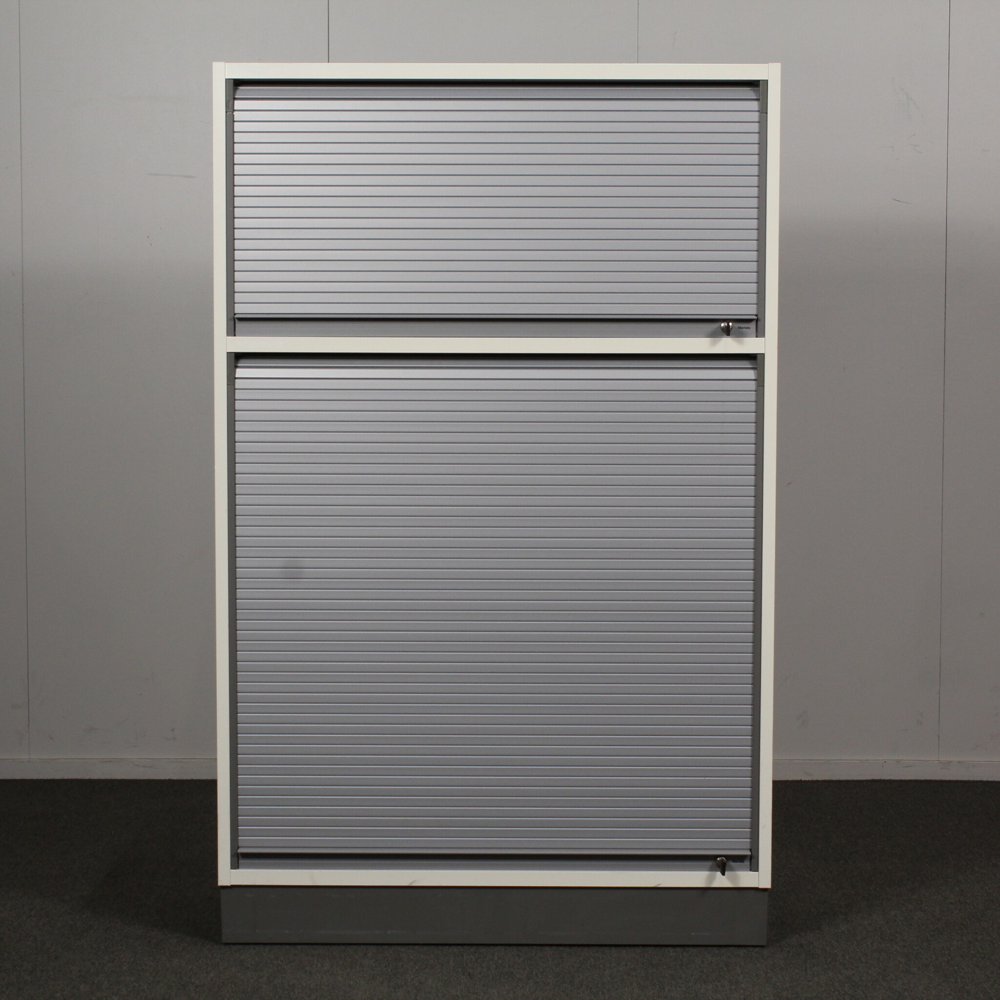 Käytetty Martela Combo rulokaappi, siistissä kunnossa. Tämä kaappi on varusteltu kahdella pystysuuntaan aukeavalla rulo-ovella.