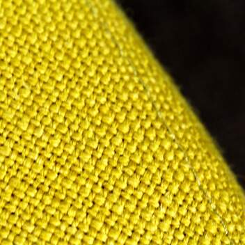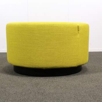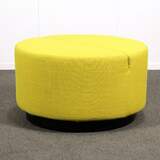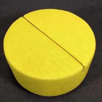 Halkaisija 70 cm, korkeus 40 cm. Kangas keltainen, sokkelijalusta musta.