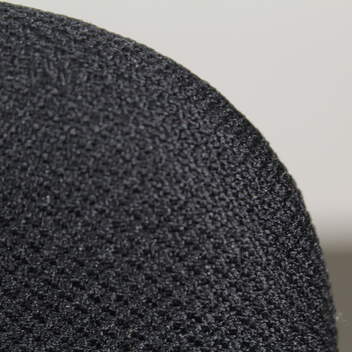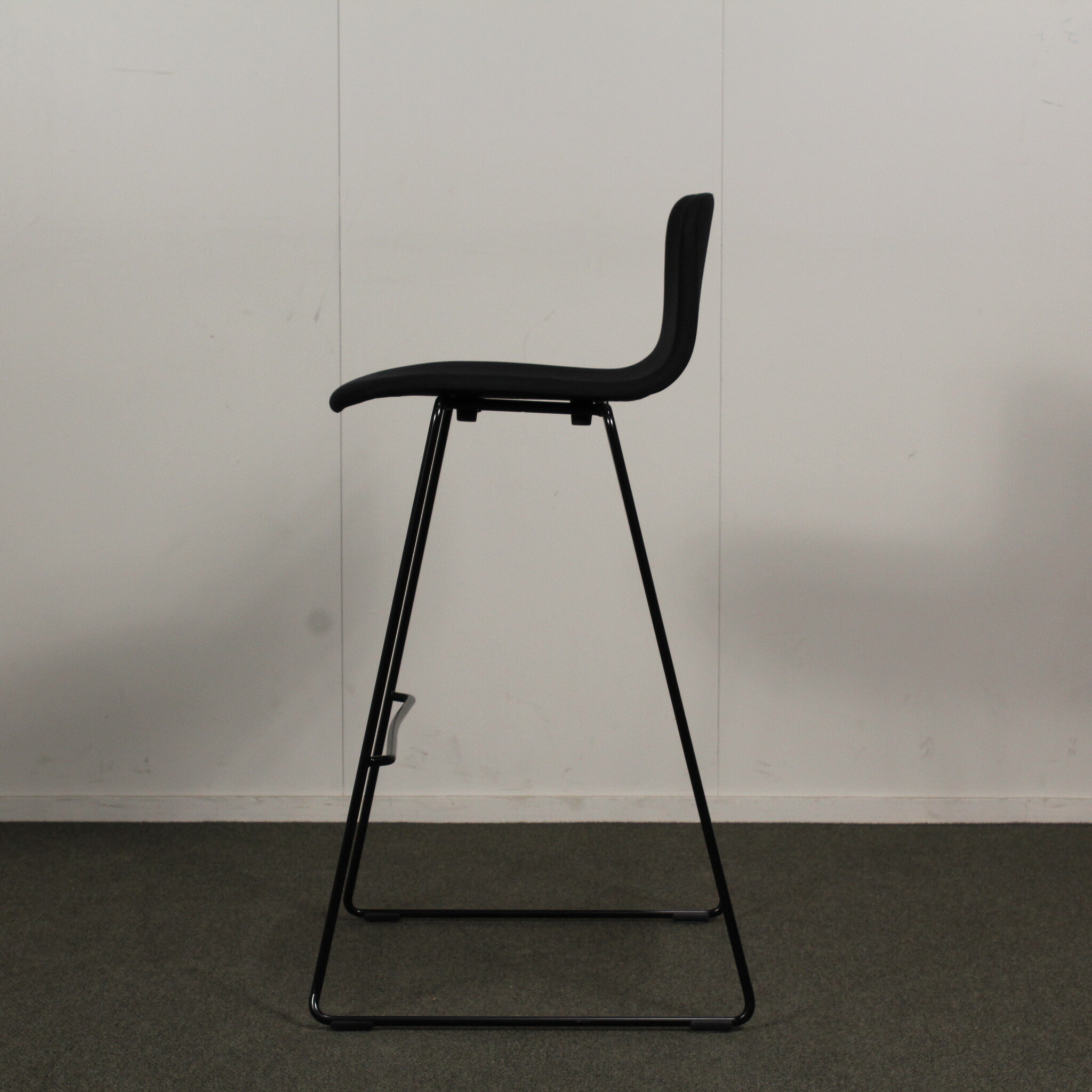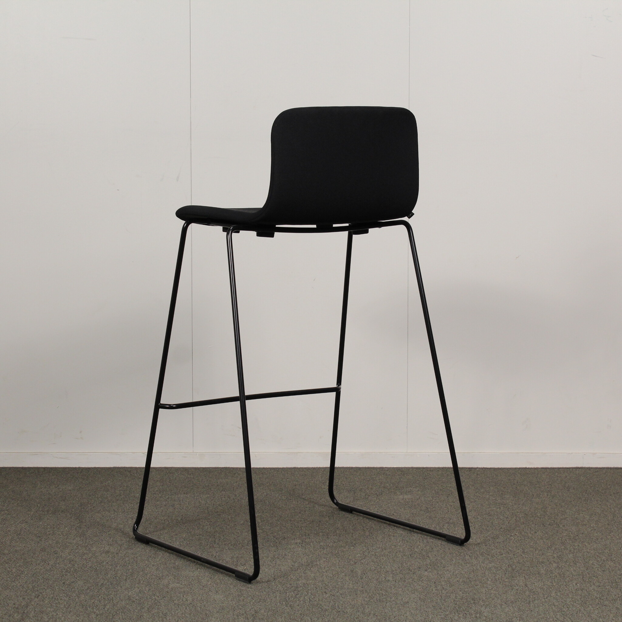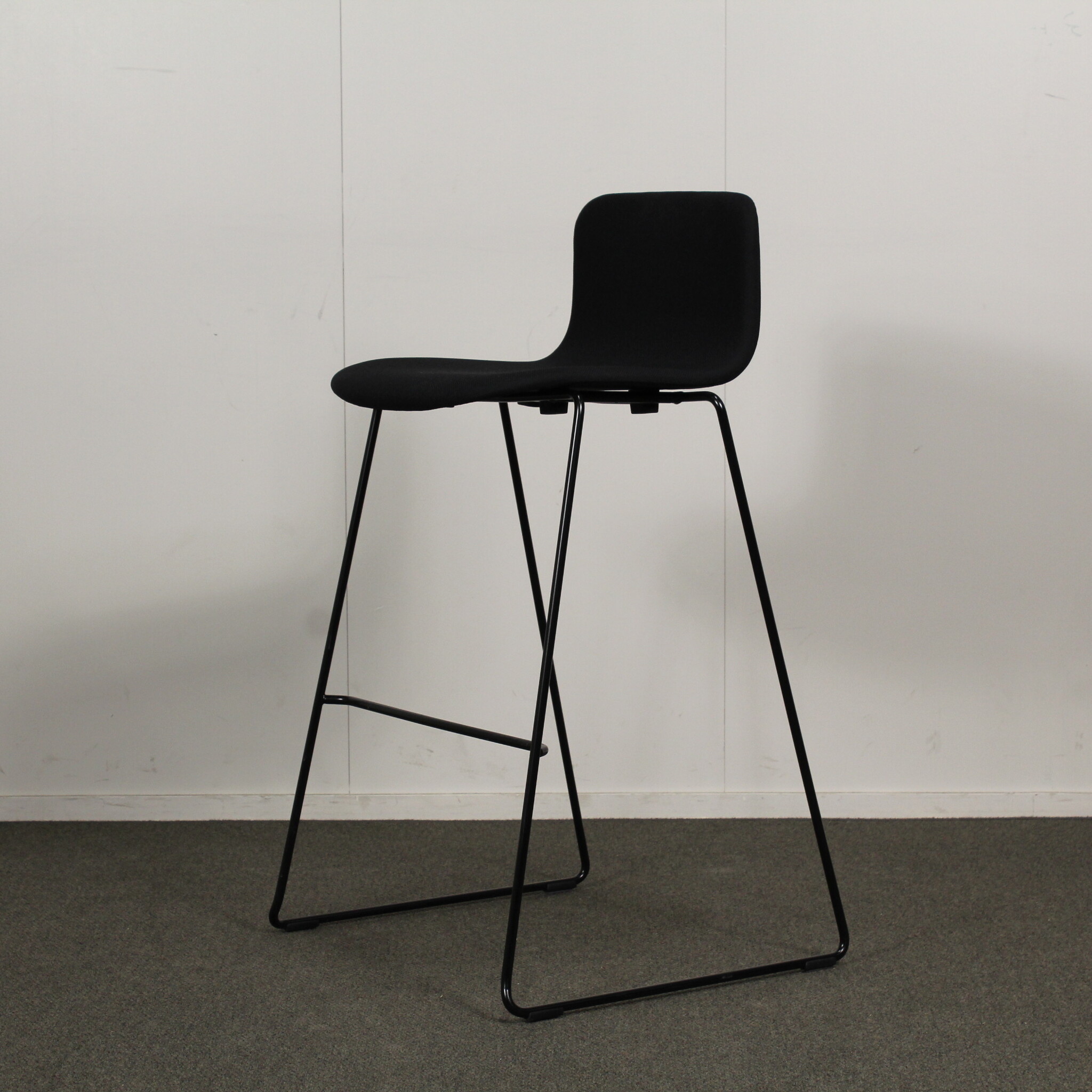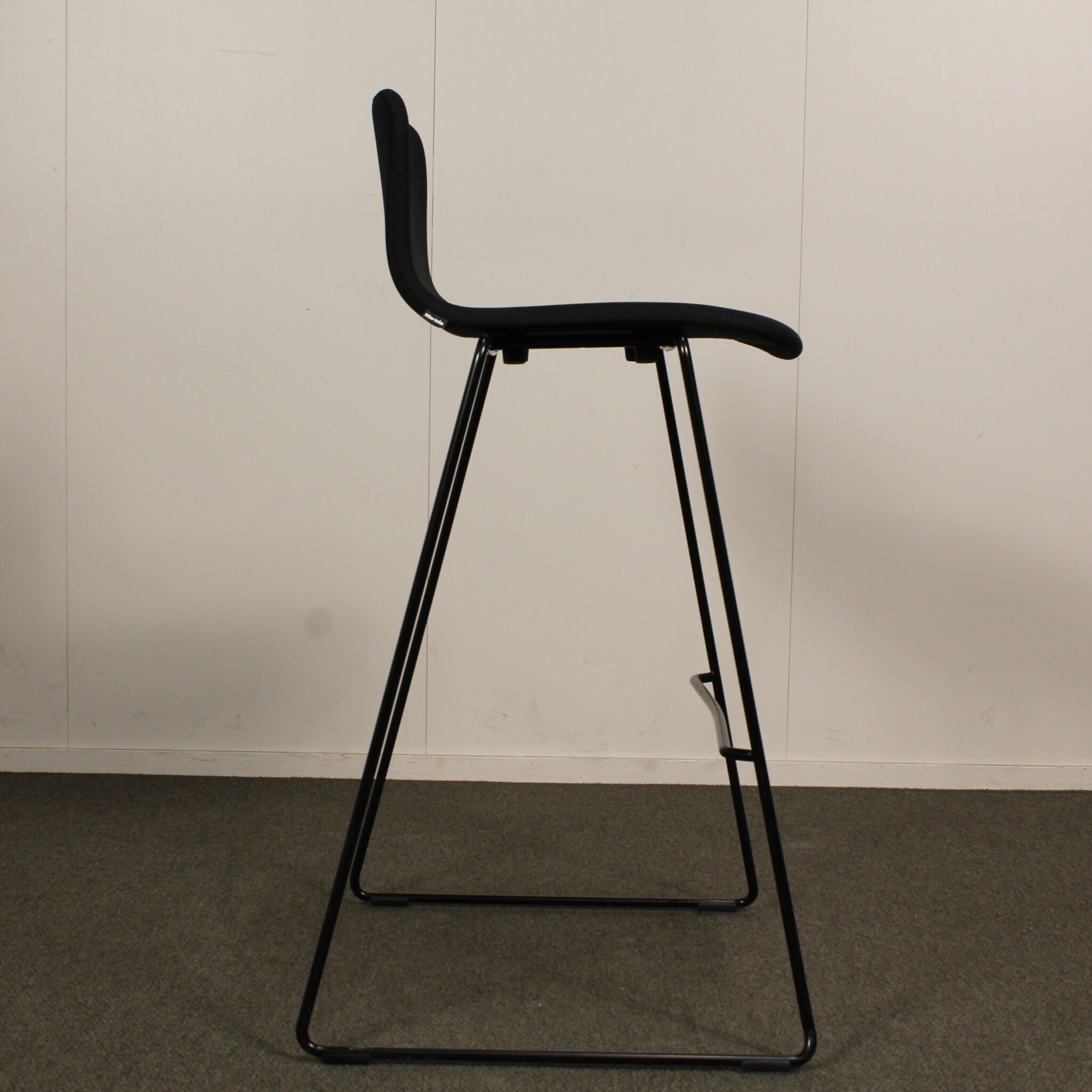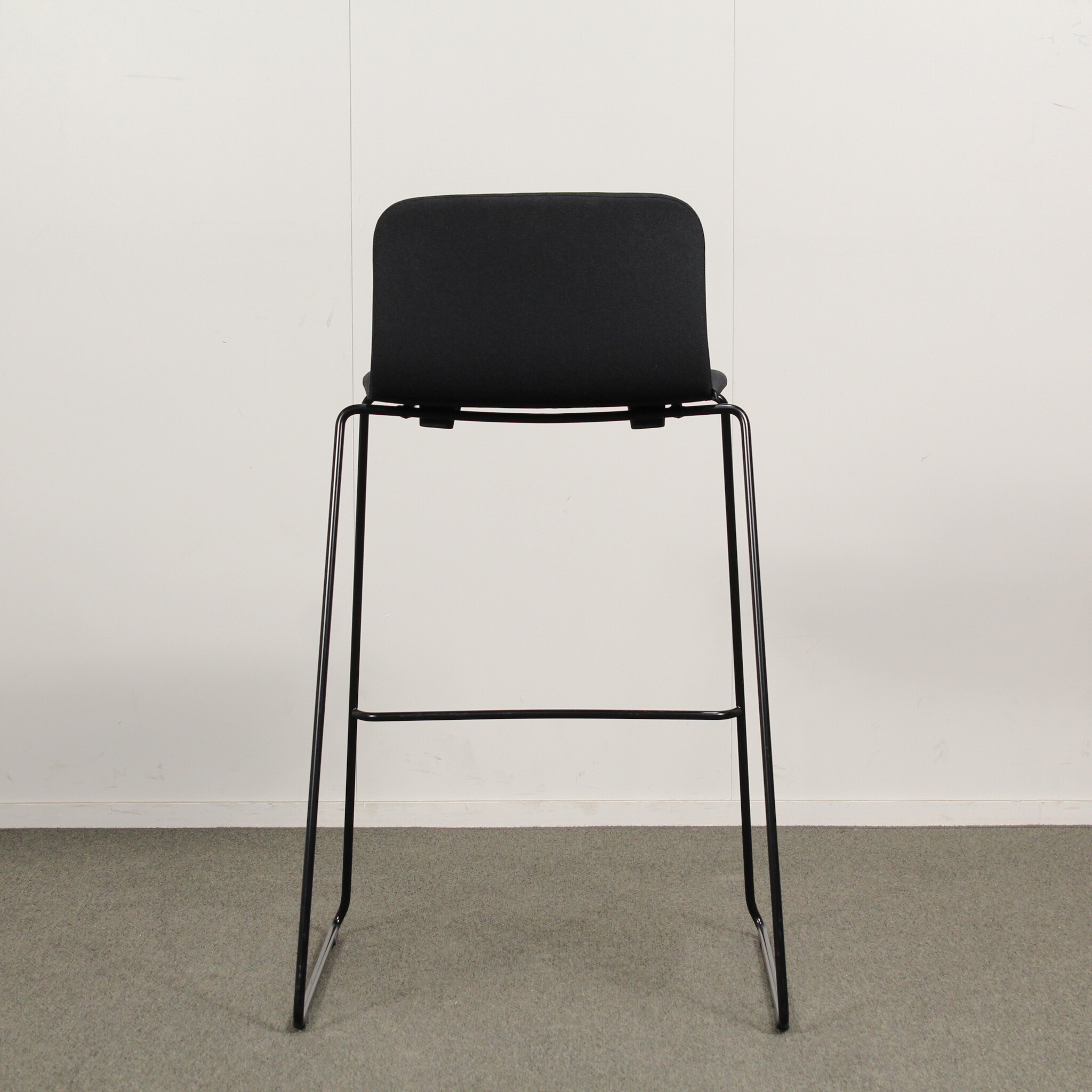 Istumakorkeus noin 75 cm. Kangasverhoilu. Lenkkijalusta pulverimaalattu musta metalli.