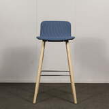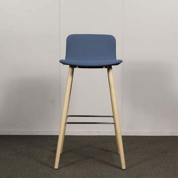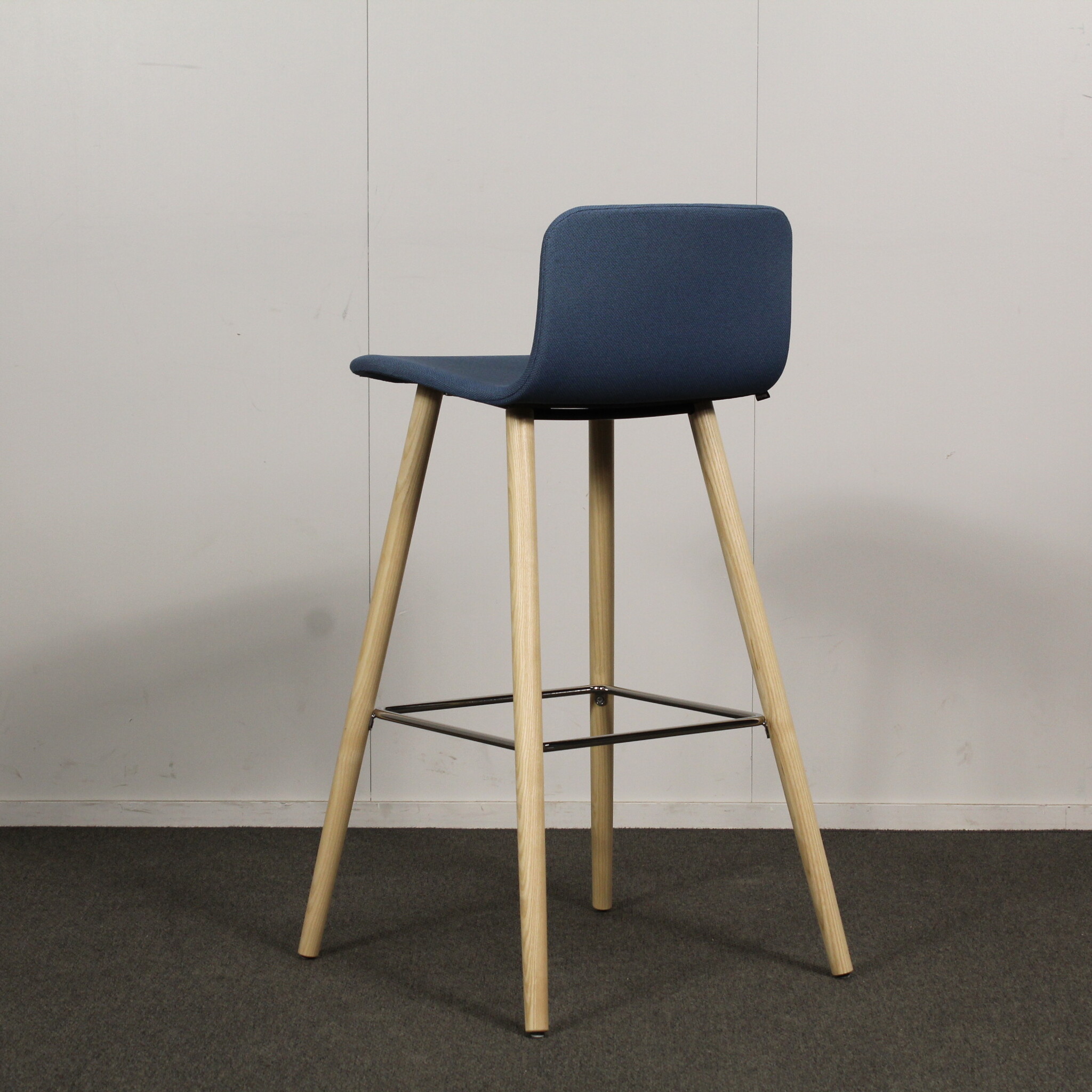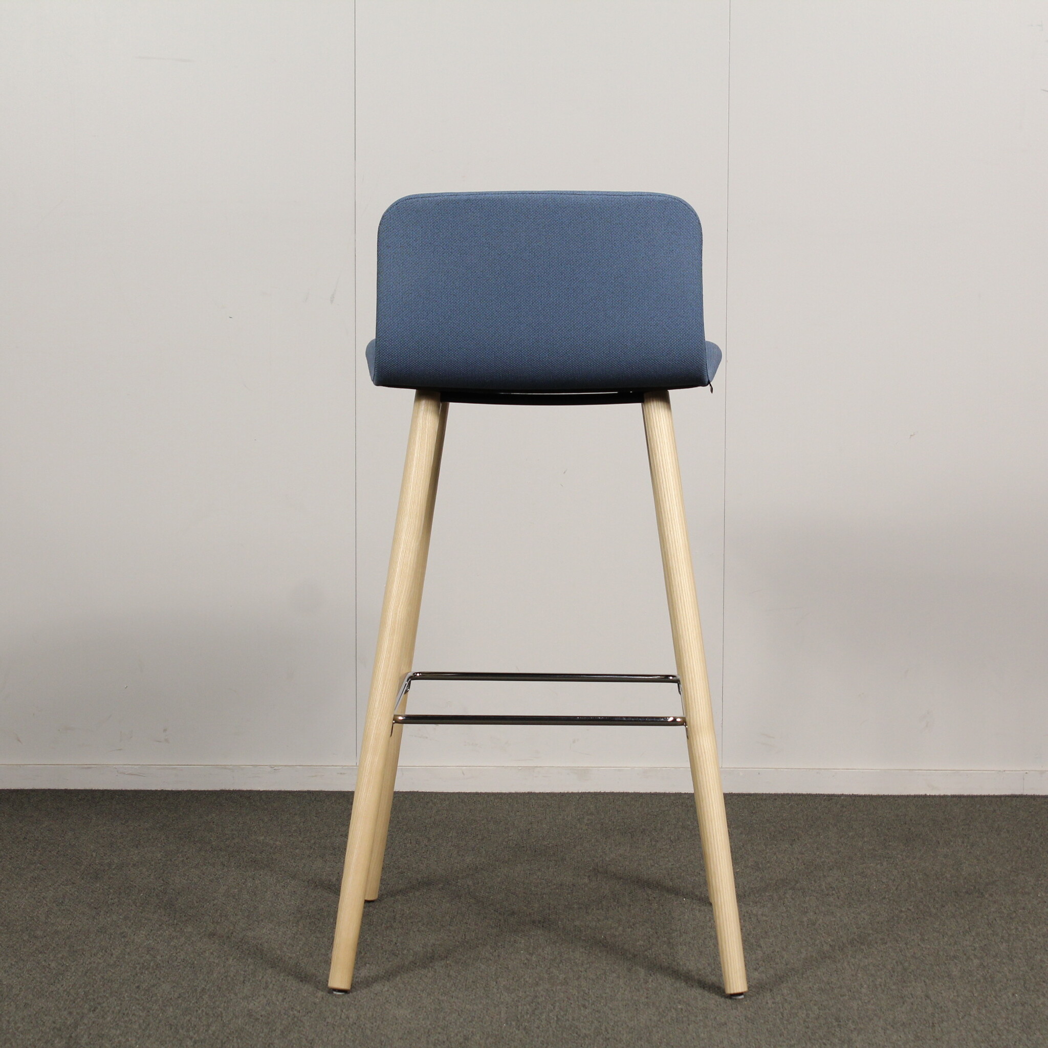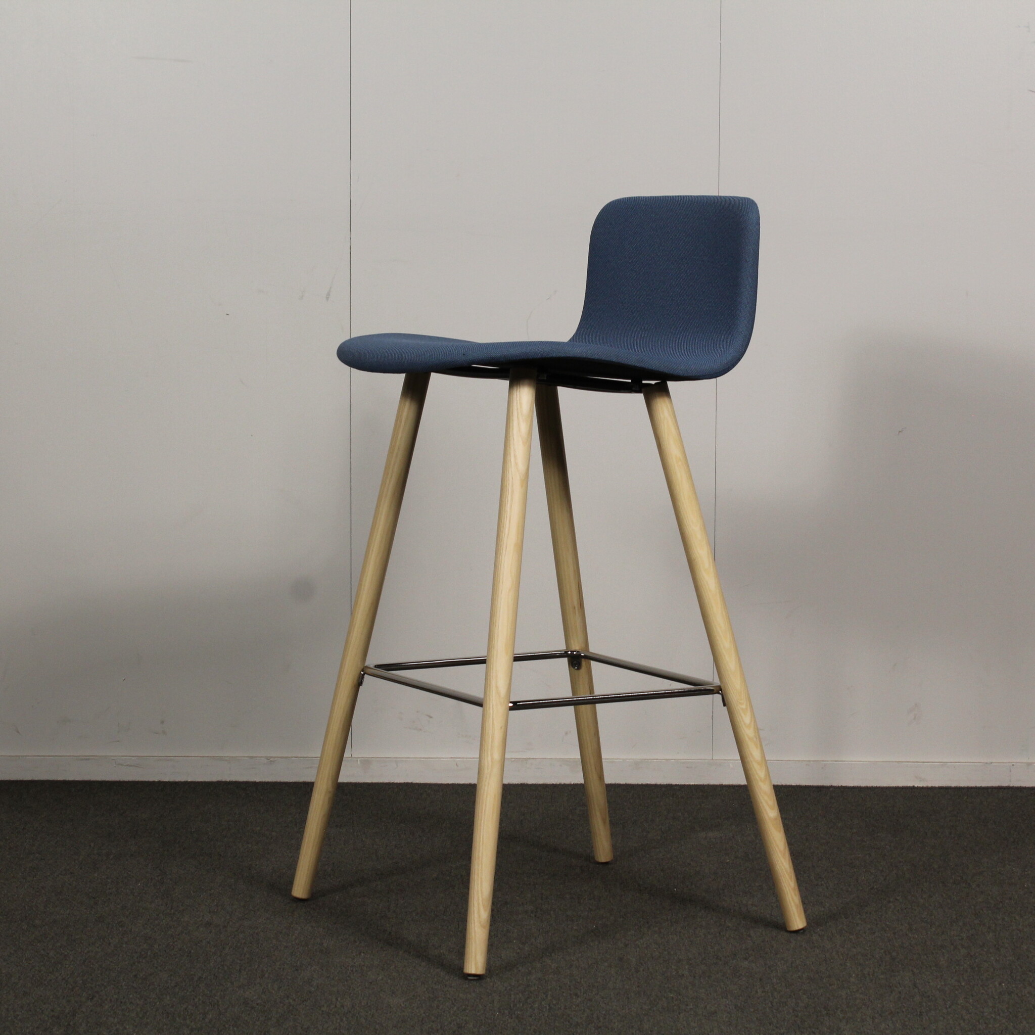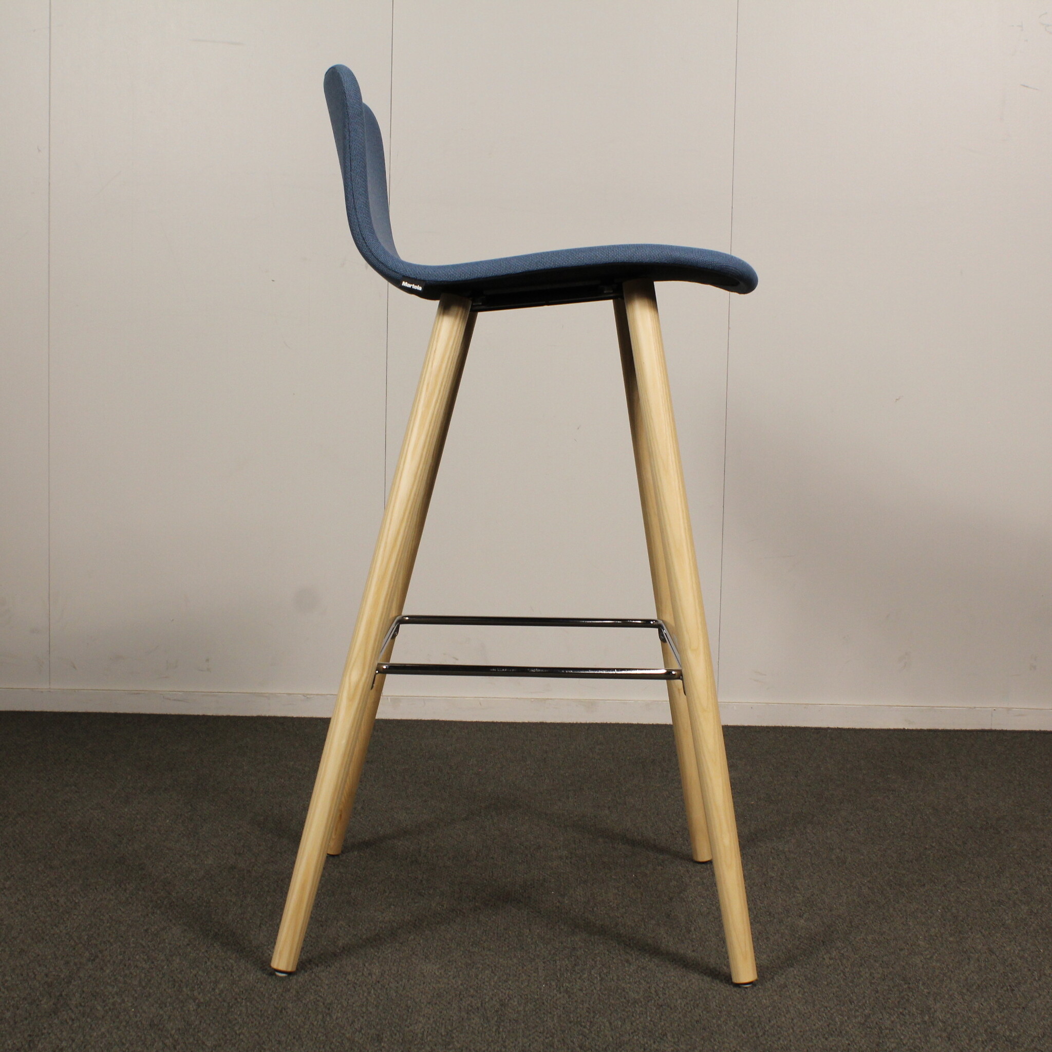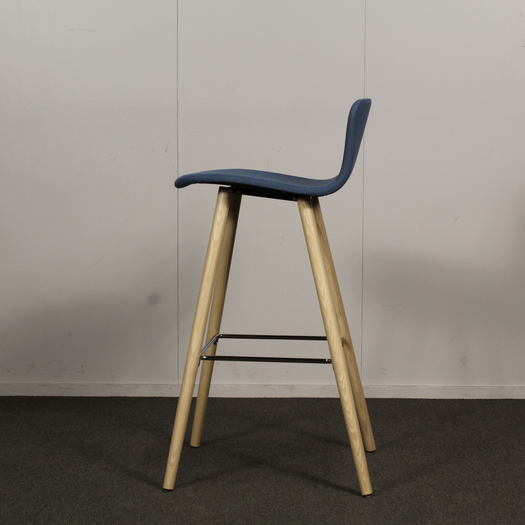 Erittäin hyväkuntoinen, käytetty Martela Sola-istuinsarjan baarijakkara. Tässä tuolissa on siisti sininen kangasverhoilu ja tyylikkäät puujalat.