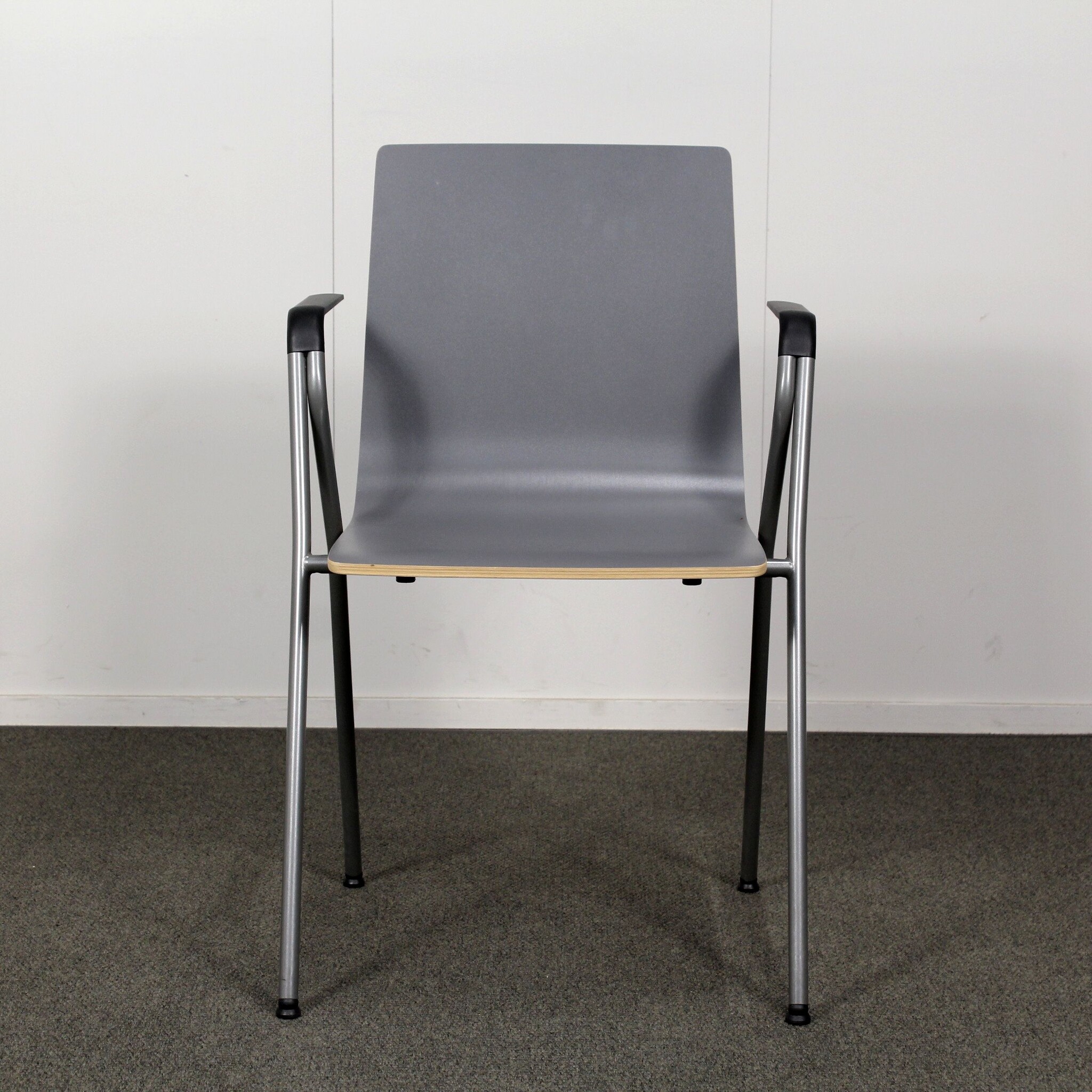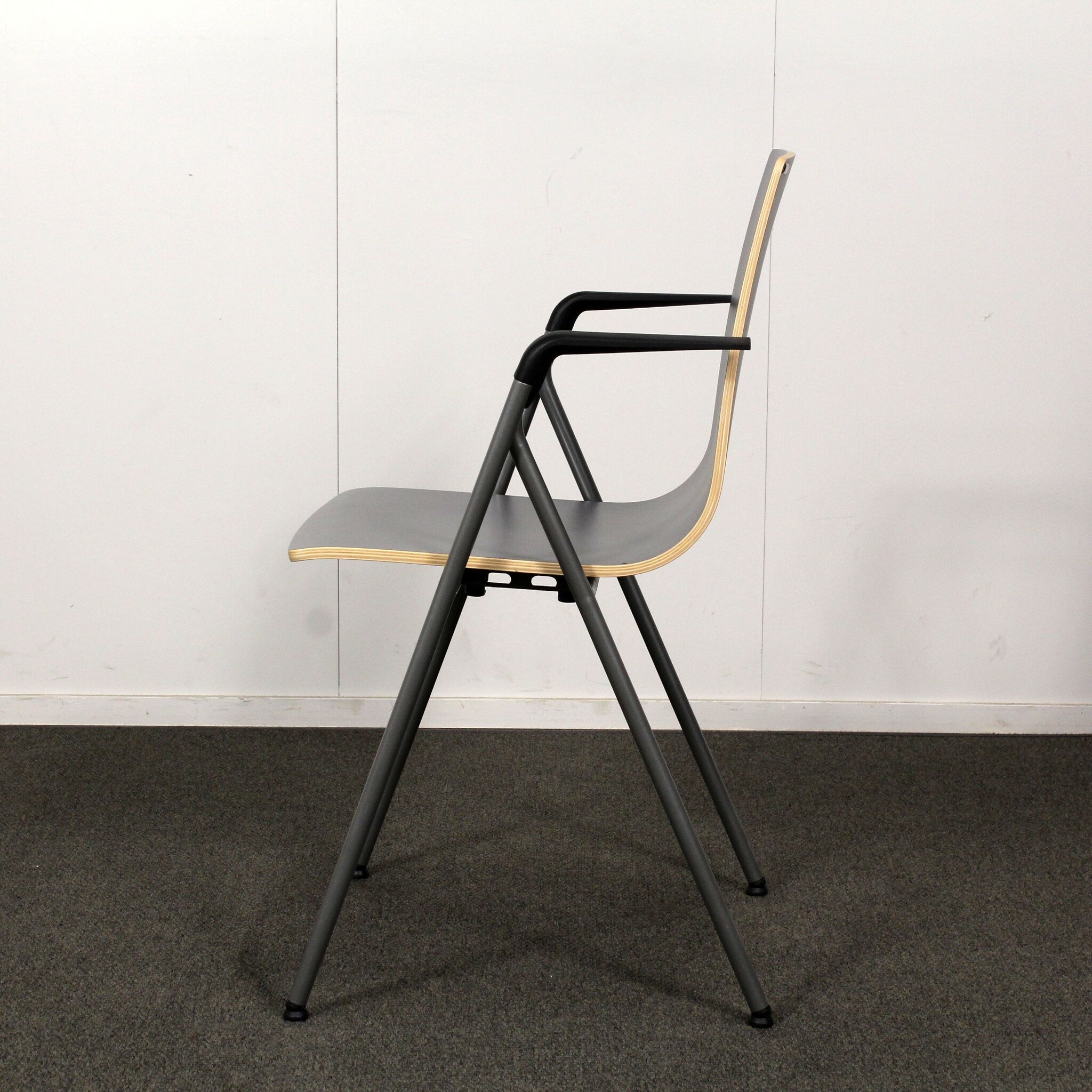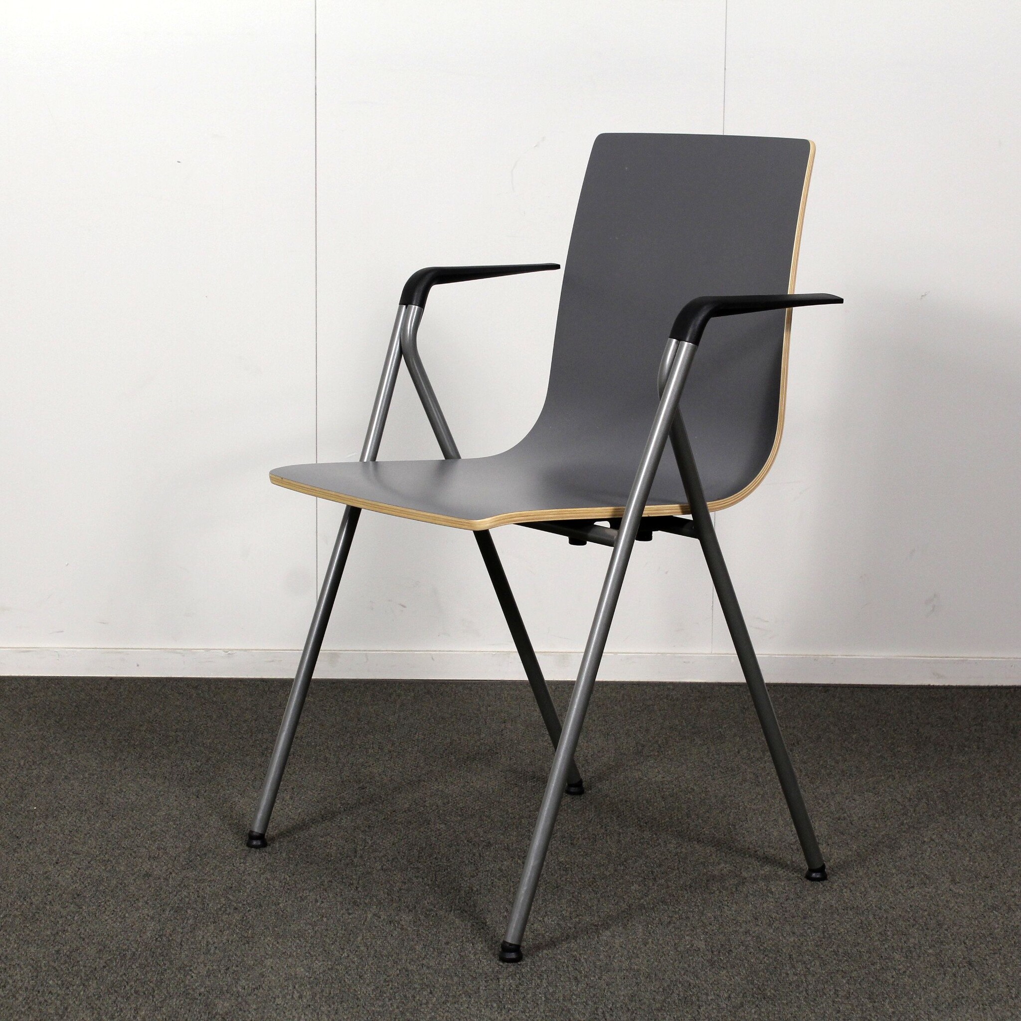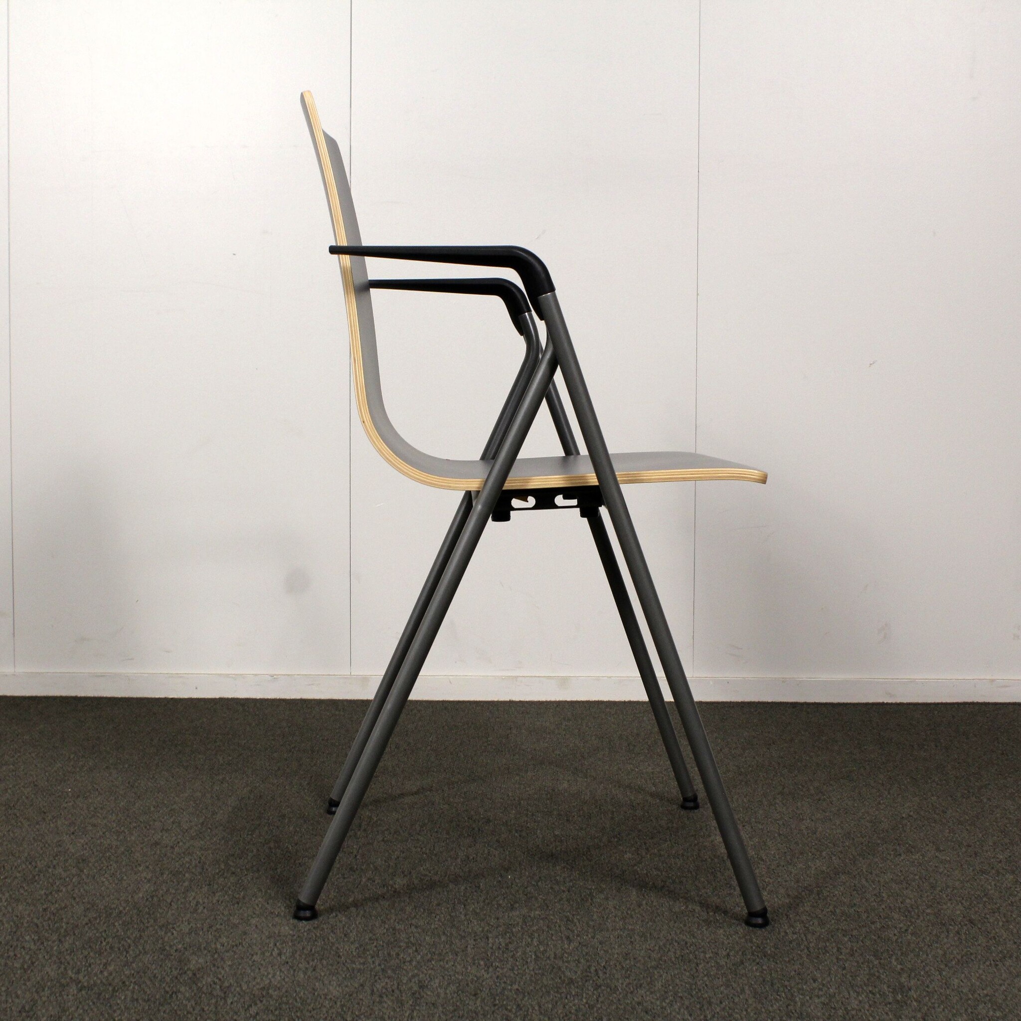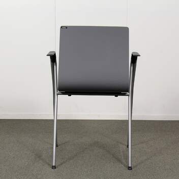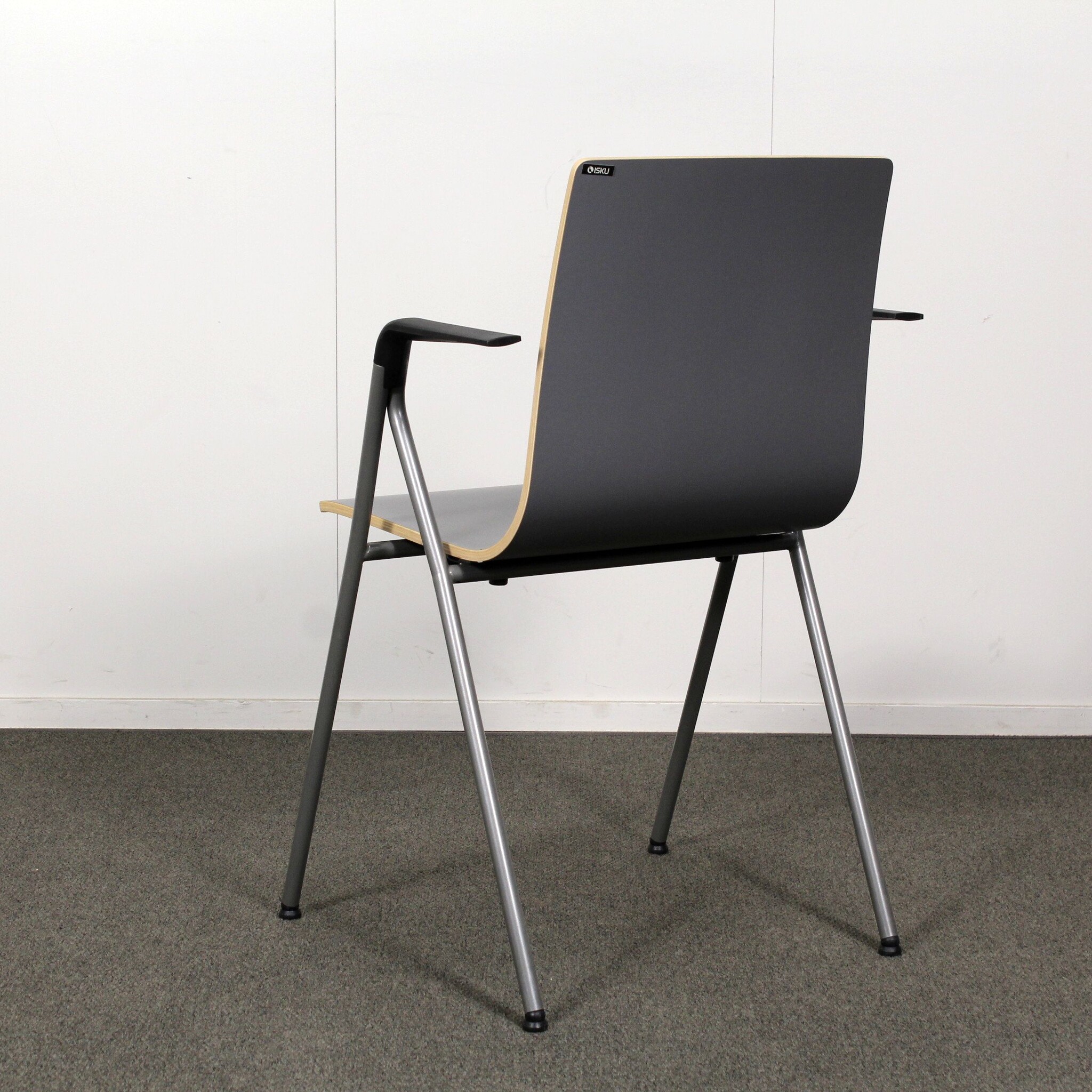 Erittäin hyväkuntoinen, käytetty Iskun Rudolf yleistuoli. Tässä tuolissa on harmaa laminaatti-istuin ja harmaa käsinojallinen metallirunko.