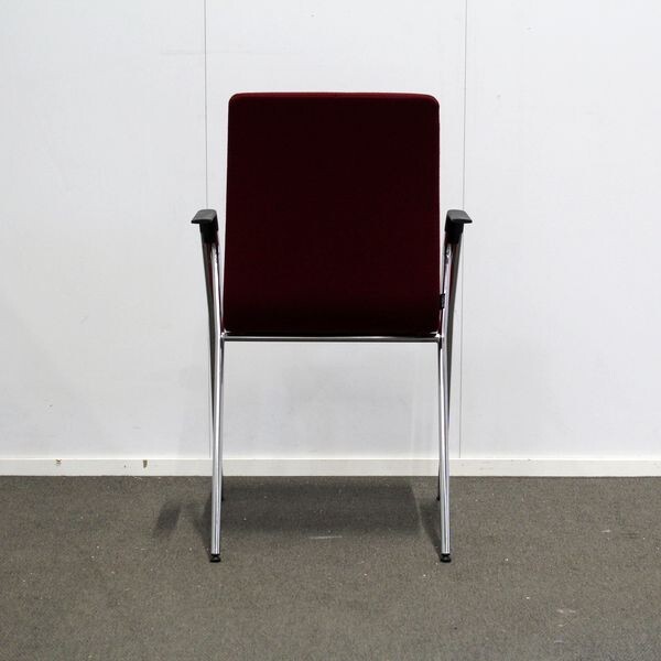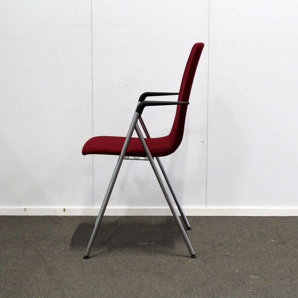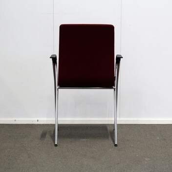 Jalusta harmaa metalli, istuinkuppi valkoinen, verhoilu viininpunainen, käsinojat.