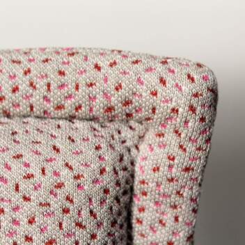Käsinojat ja jalkaosa punainen, verhoiluosat meleerattu harmaa