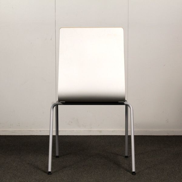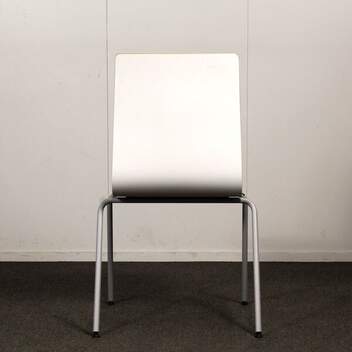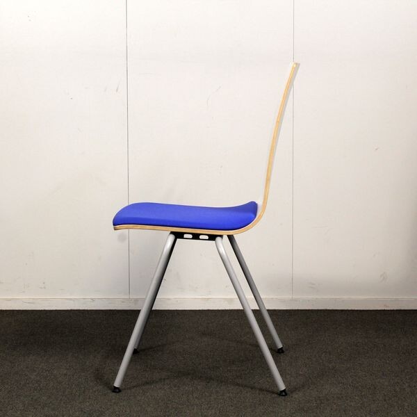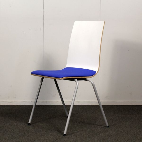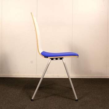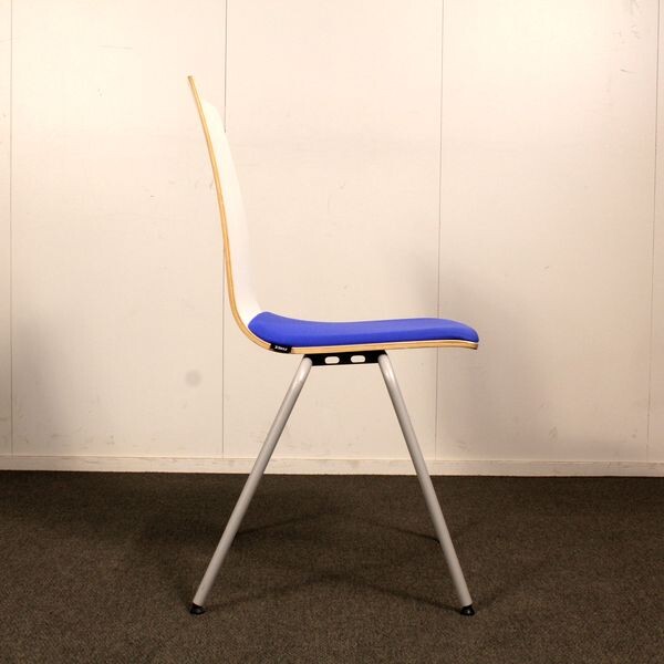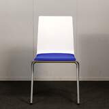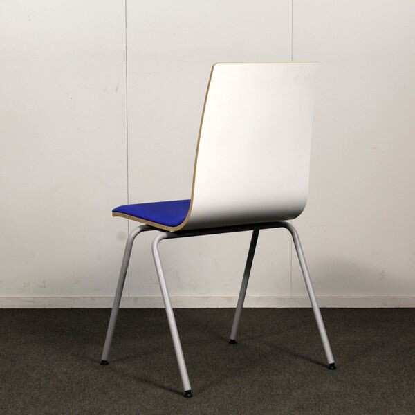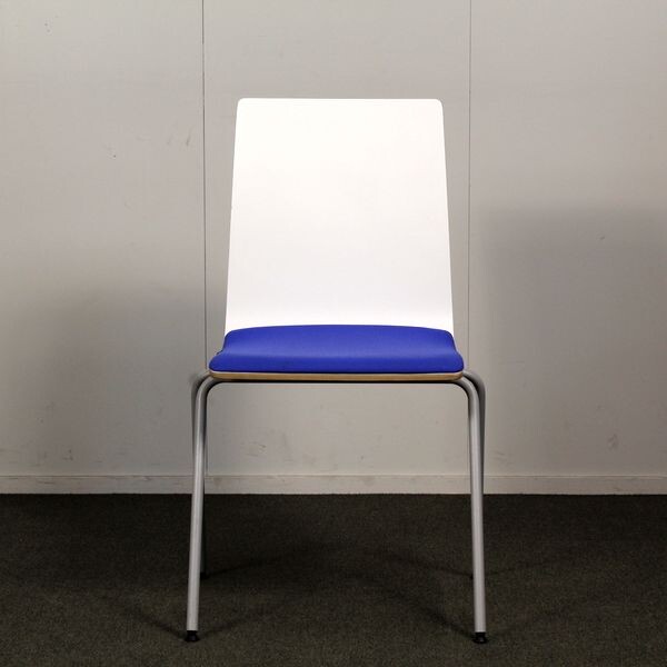 Jalusta harmaa metalli, istuinkuppi valkoinen, istuinverhoilu sininen. Pinottava.
