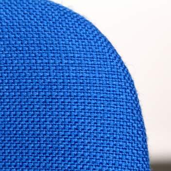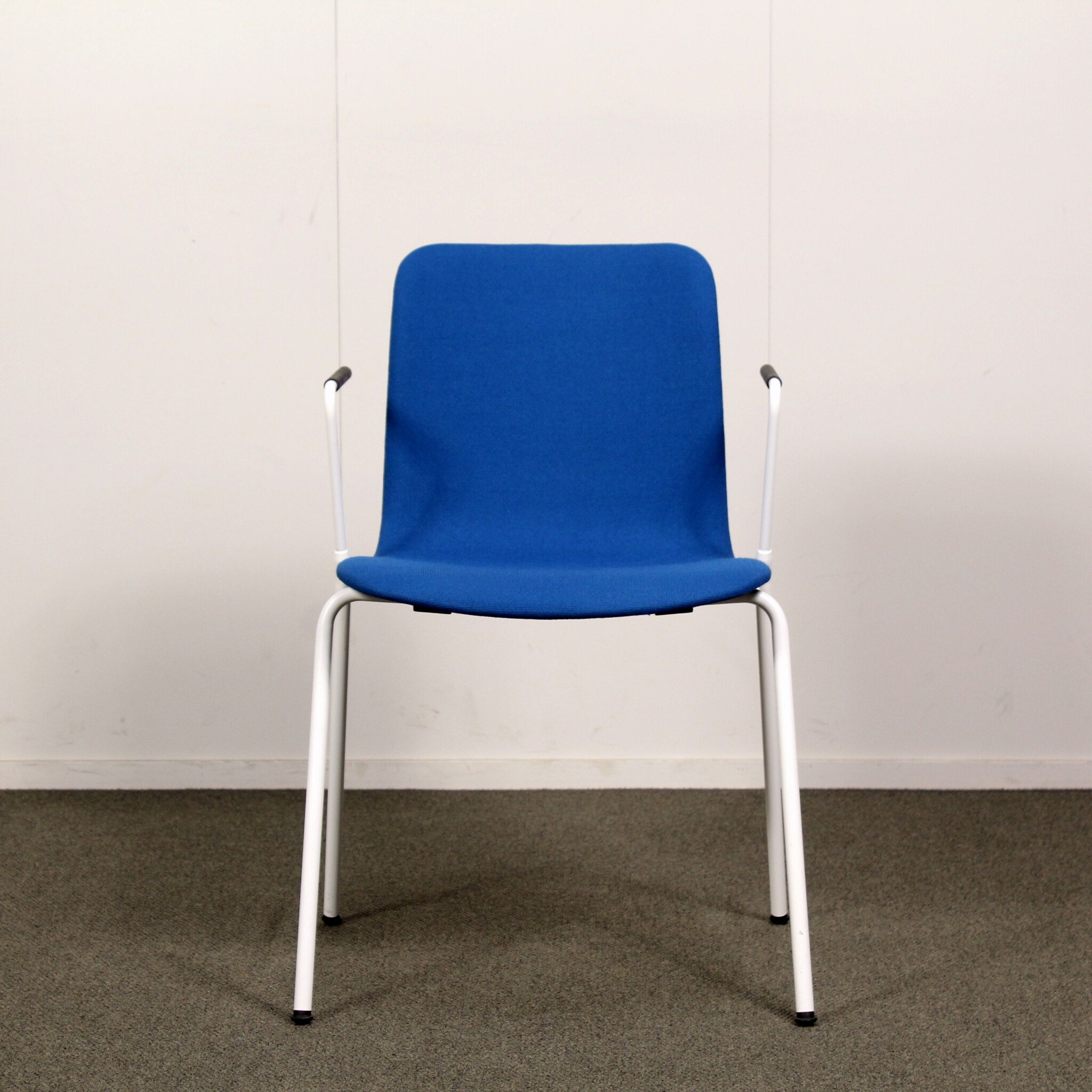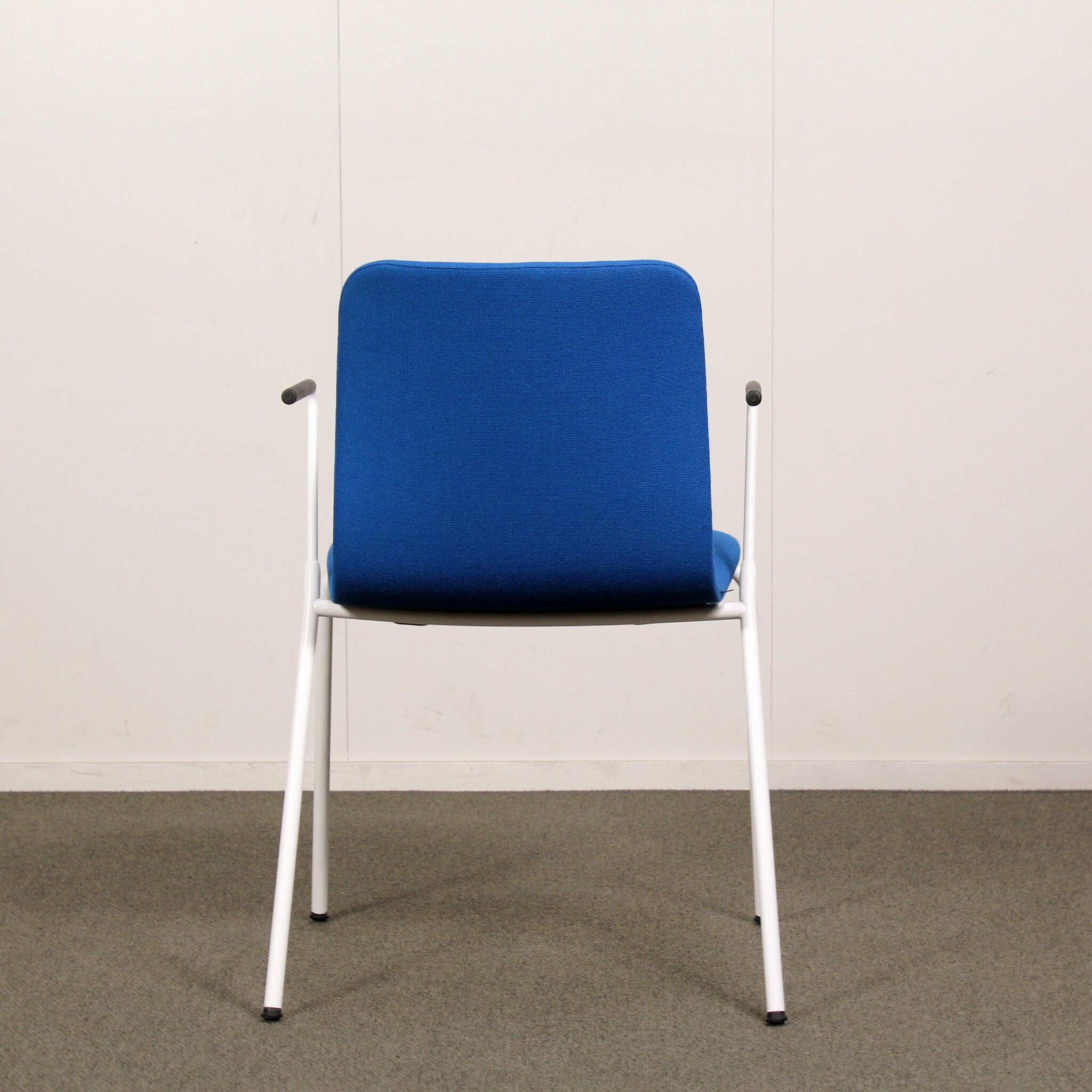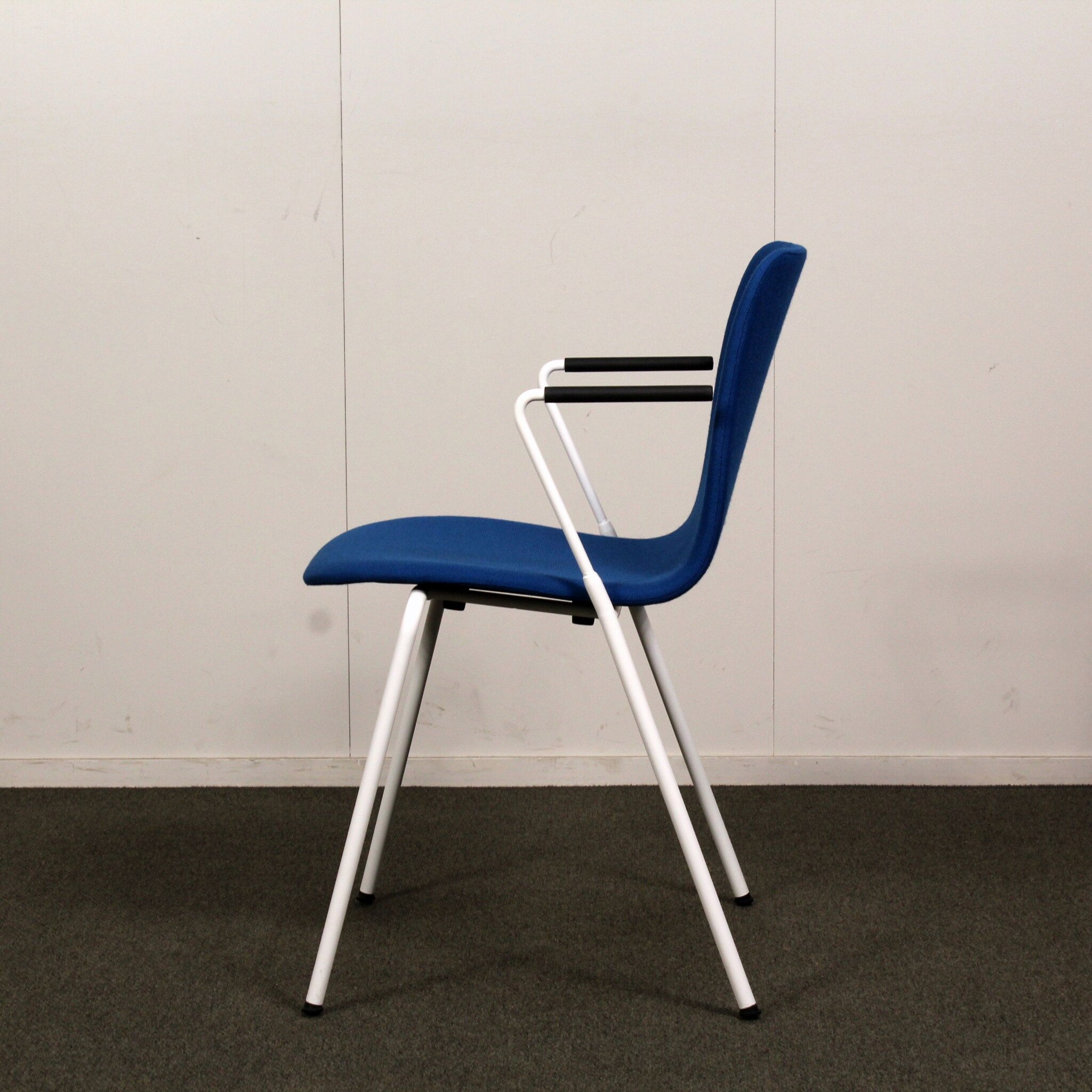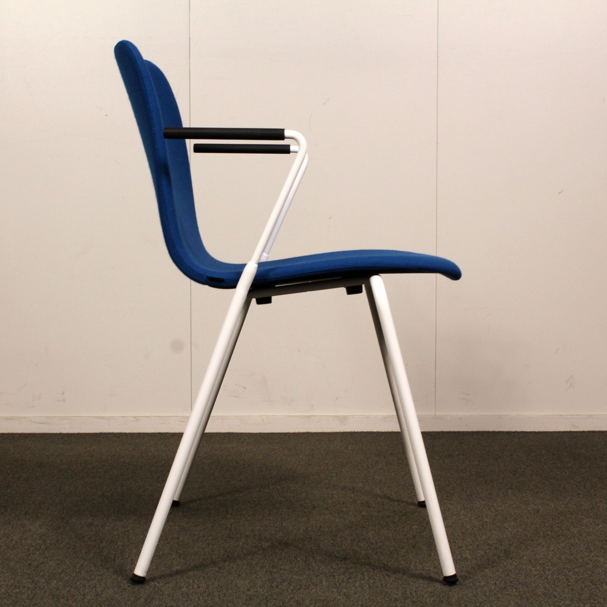 Valkoinen runko ja jalusta, sininen verhoilu. Pinottava.