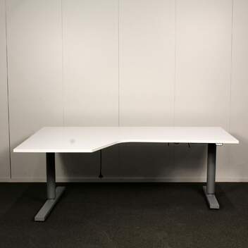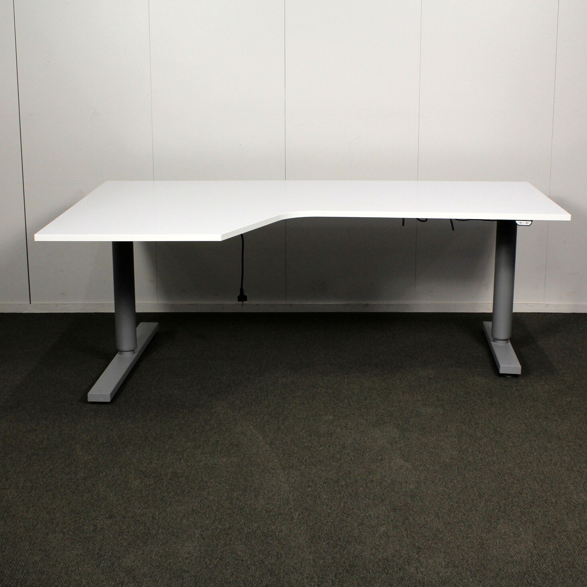 Laadukas, käytetty Martela Pinta E kulmasähköpöytä valkoisella kannella. Tässä sähköpöydässä on laaja 65 cm säätöalue, joka soveltuu kaikenkokoisille käyttäjille.