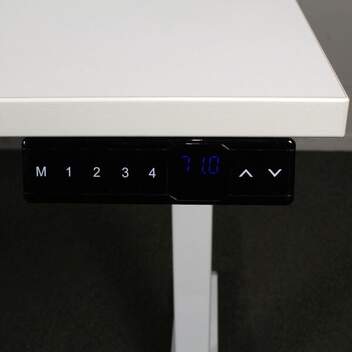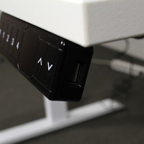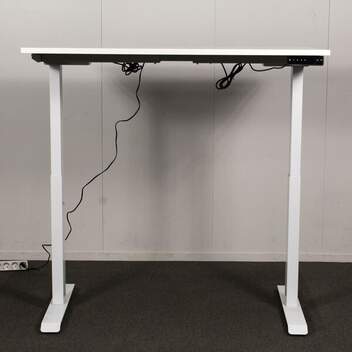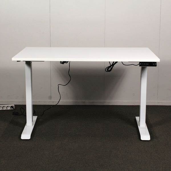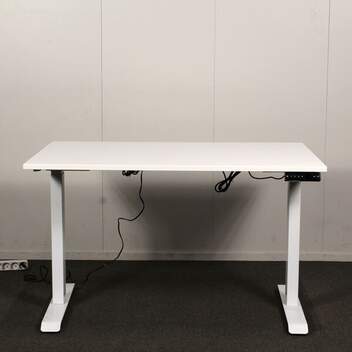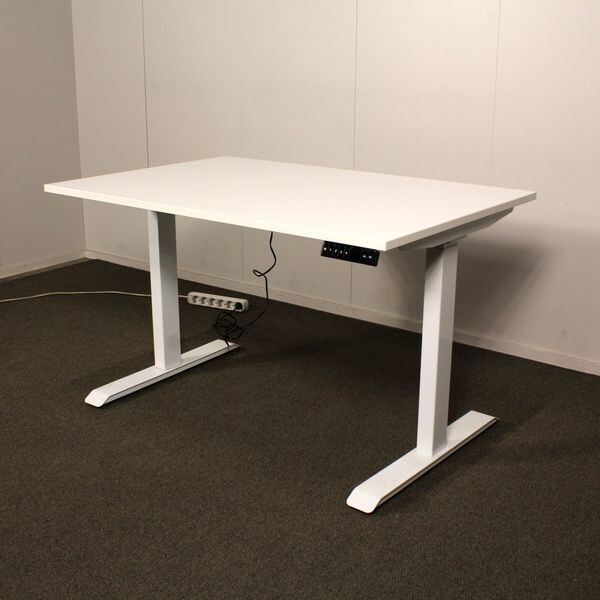 Kansi laminaattia, väri valkoinen. Jalusta pulverimaalattu, väri harmaa. Korkeudensäätöalue 71-117cm Lisävarusteena muistipaikkakytkin + USB Portti.