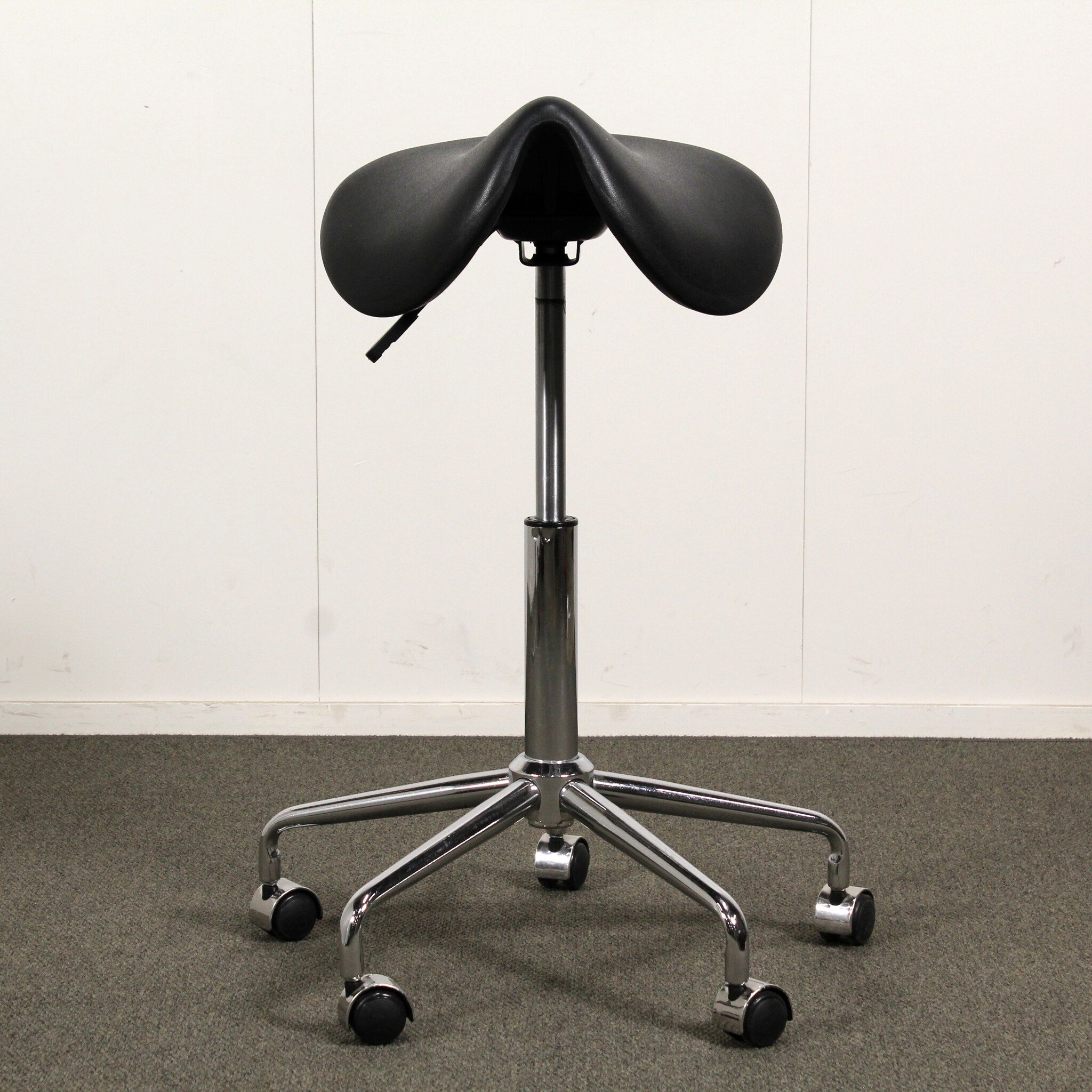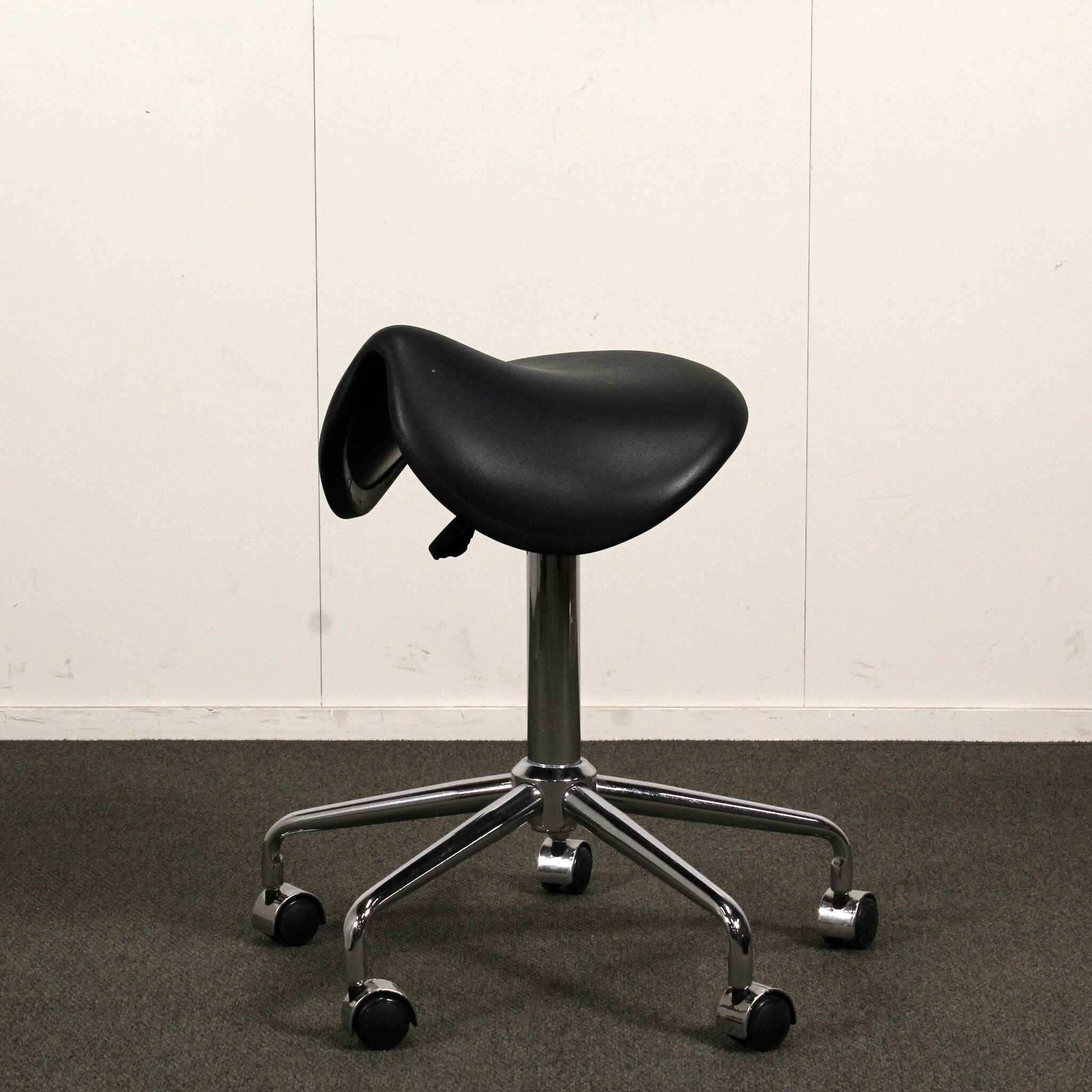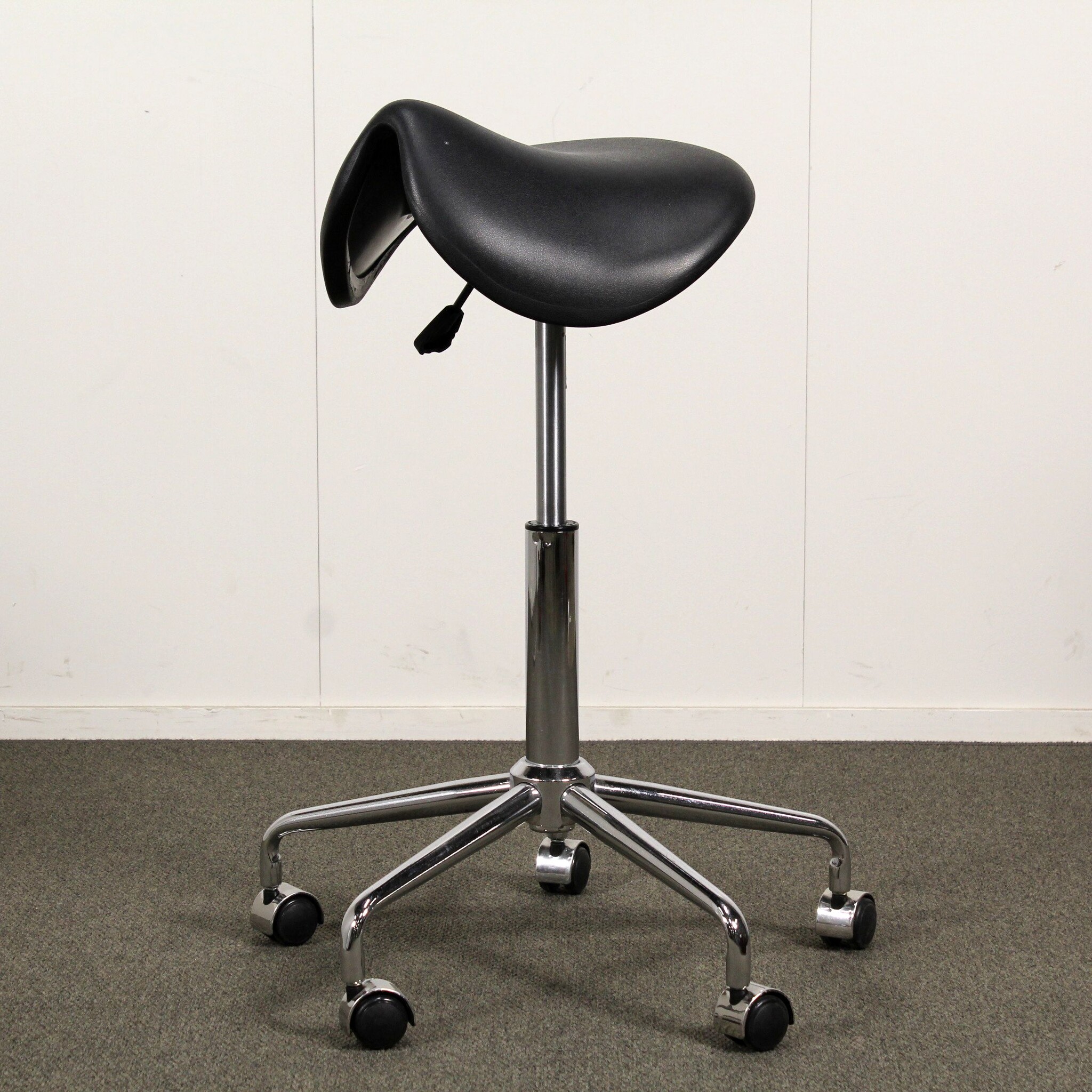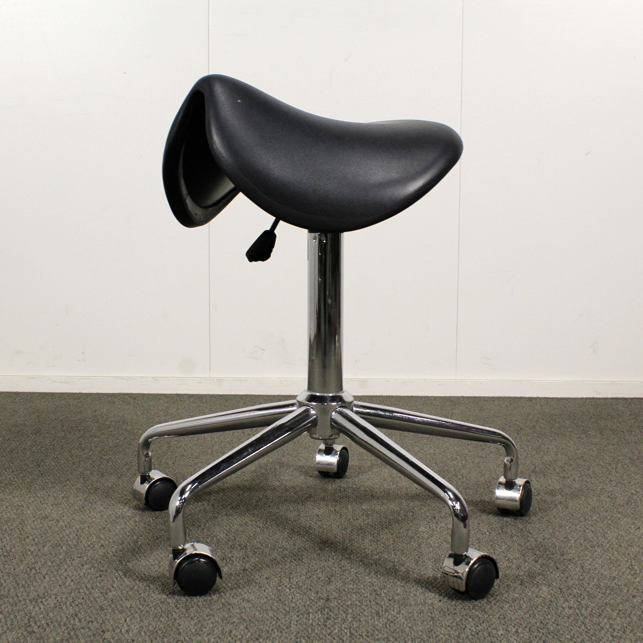 Käytetty satulatuoli, siistissä kunnossa. Tässä satulatuolissa on tukeva yksiosainen istuin ja pyörällinen jalkaristikko.