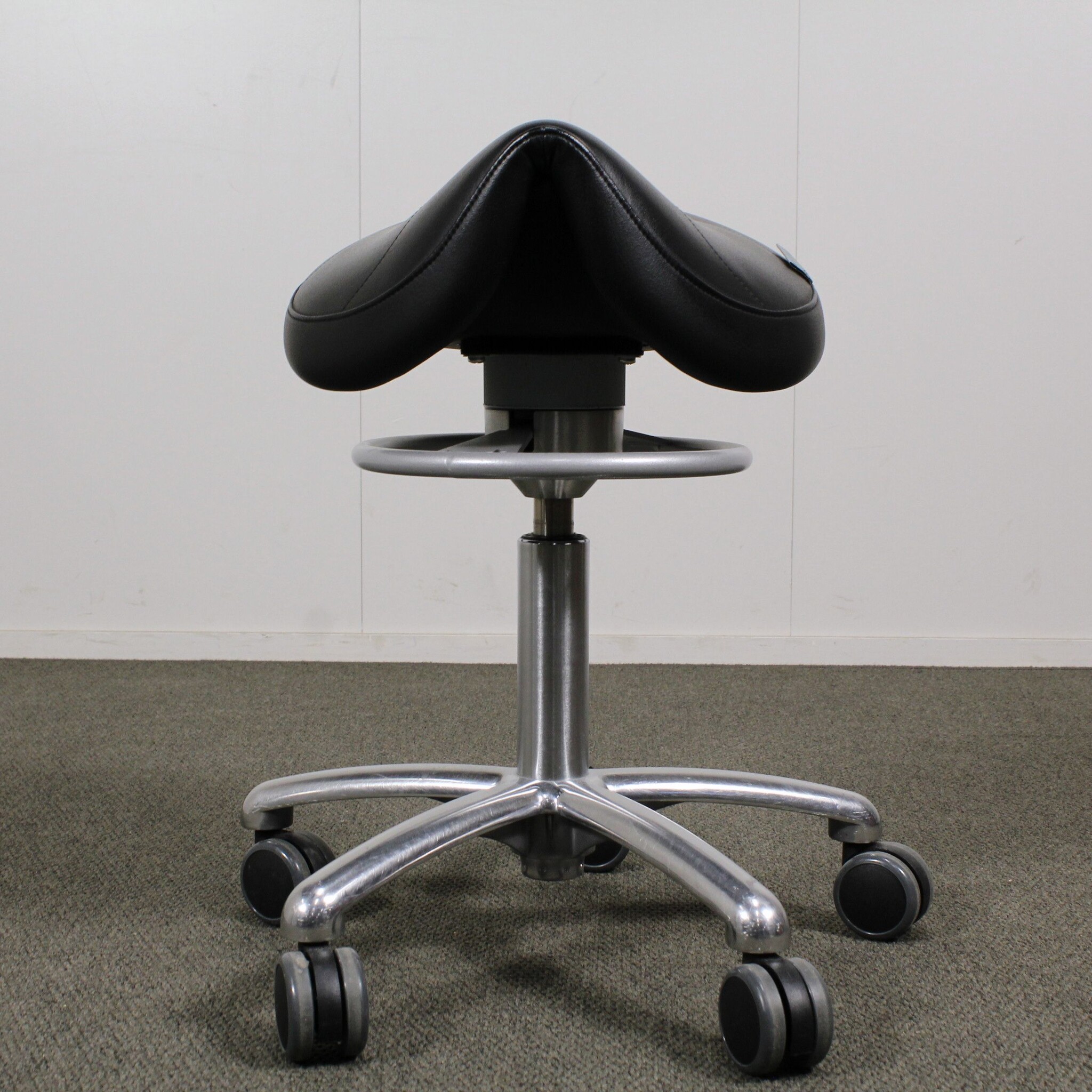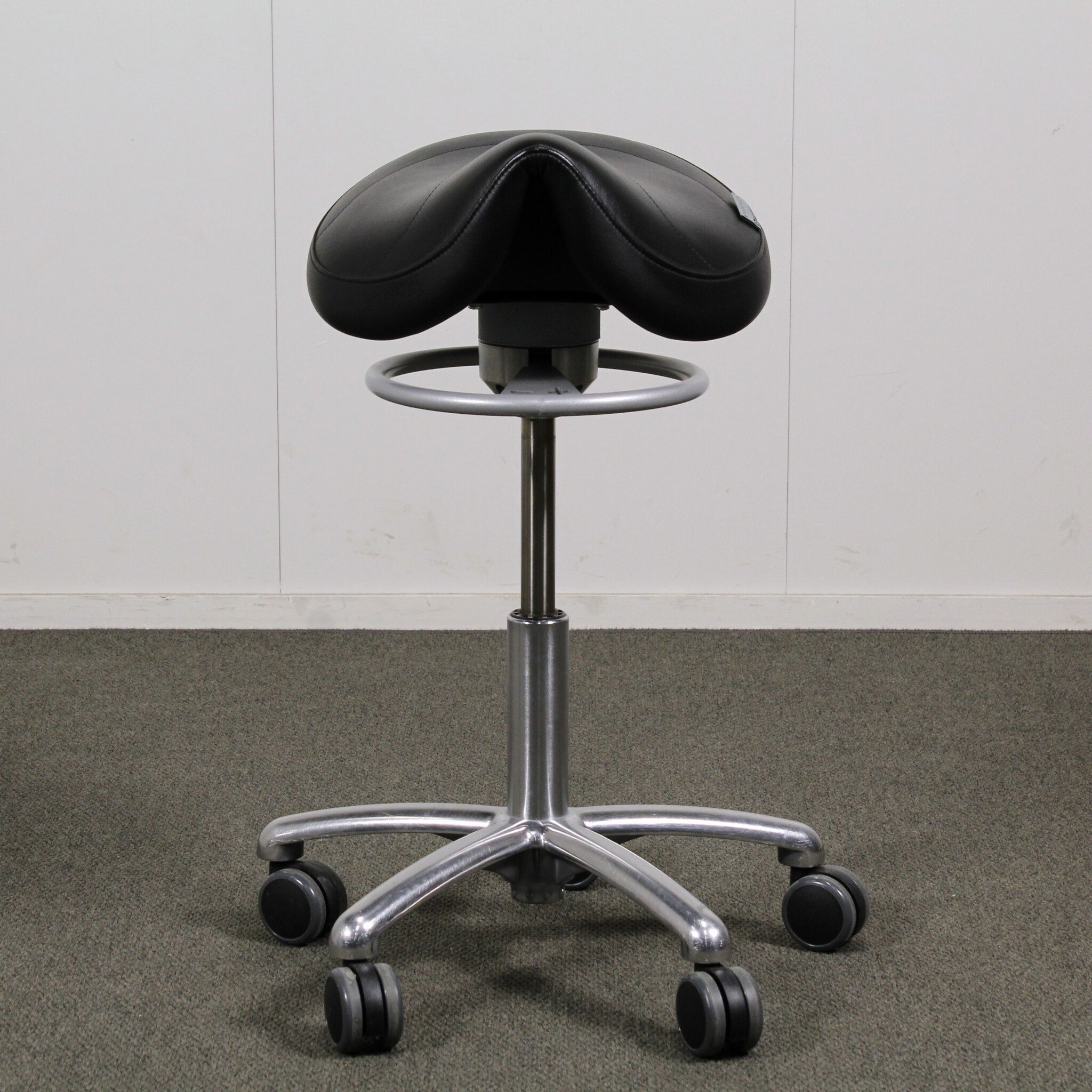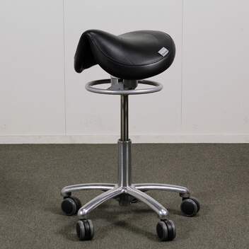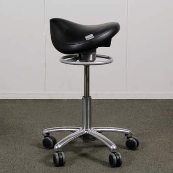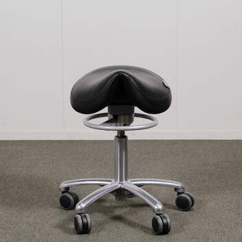 Keinuva aktiivi-istuin, korkeudensäätö noin 55-69 cm. Istuinosassa aito nahka, väri musta, jalusta metallia.