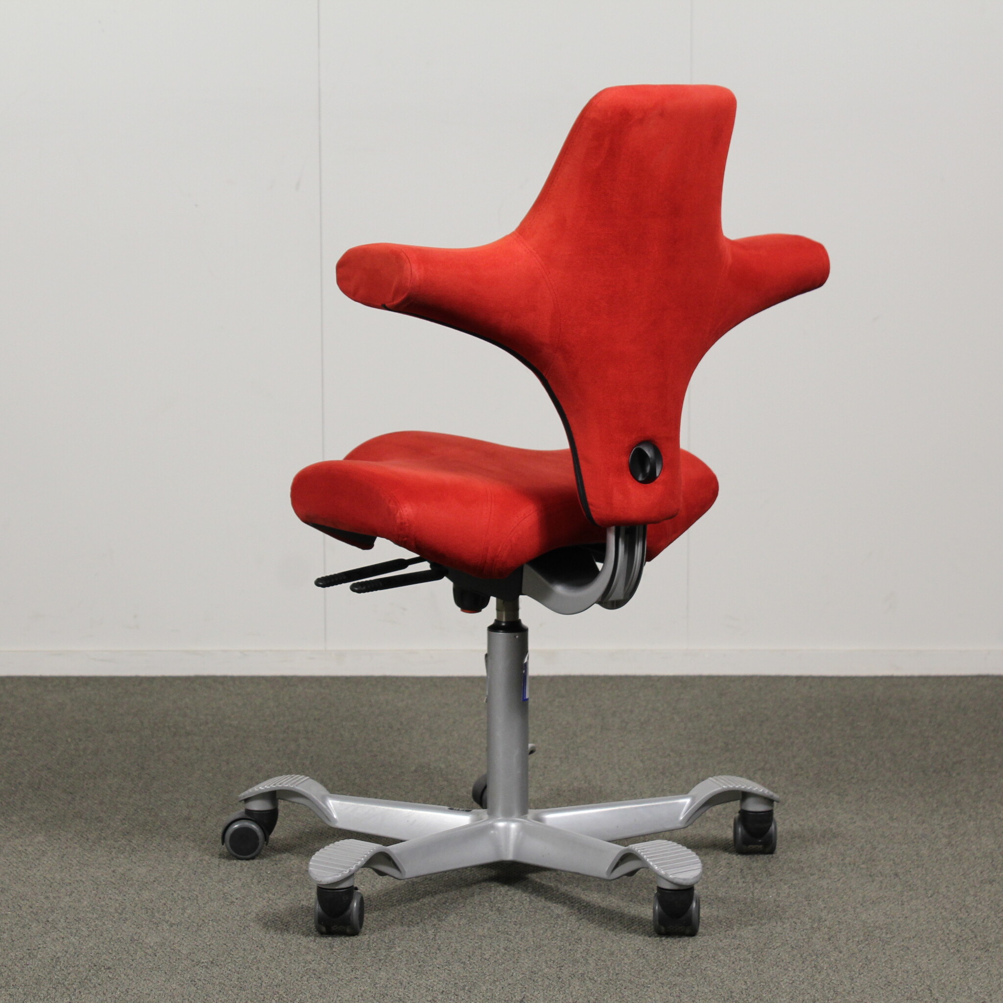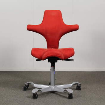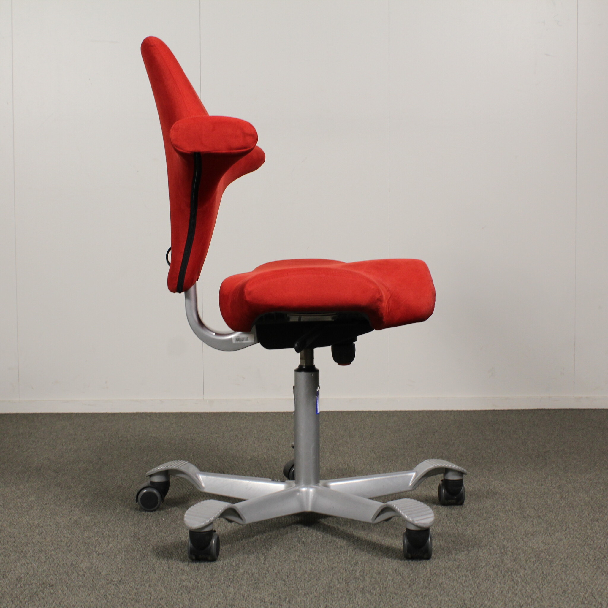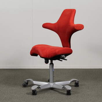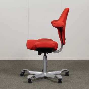 Käytetty Håg Capisco työtuoli, siistissä kunnossa. Tässä Capisco huipputuolissa on tyylikäs punainen Alcantara- tyylinen verhoilu.