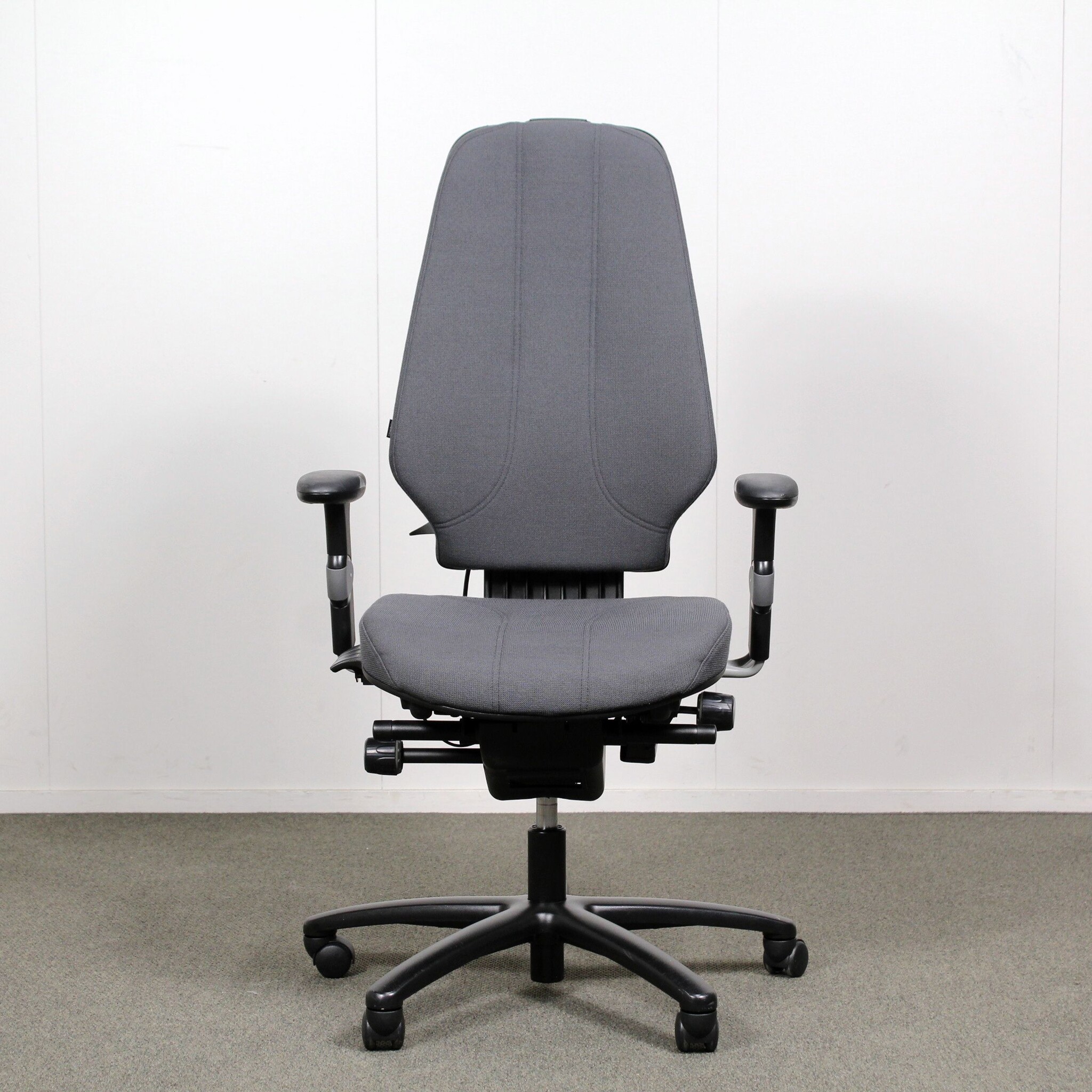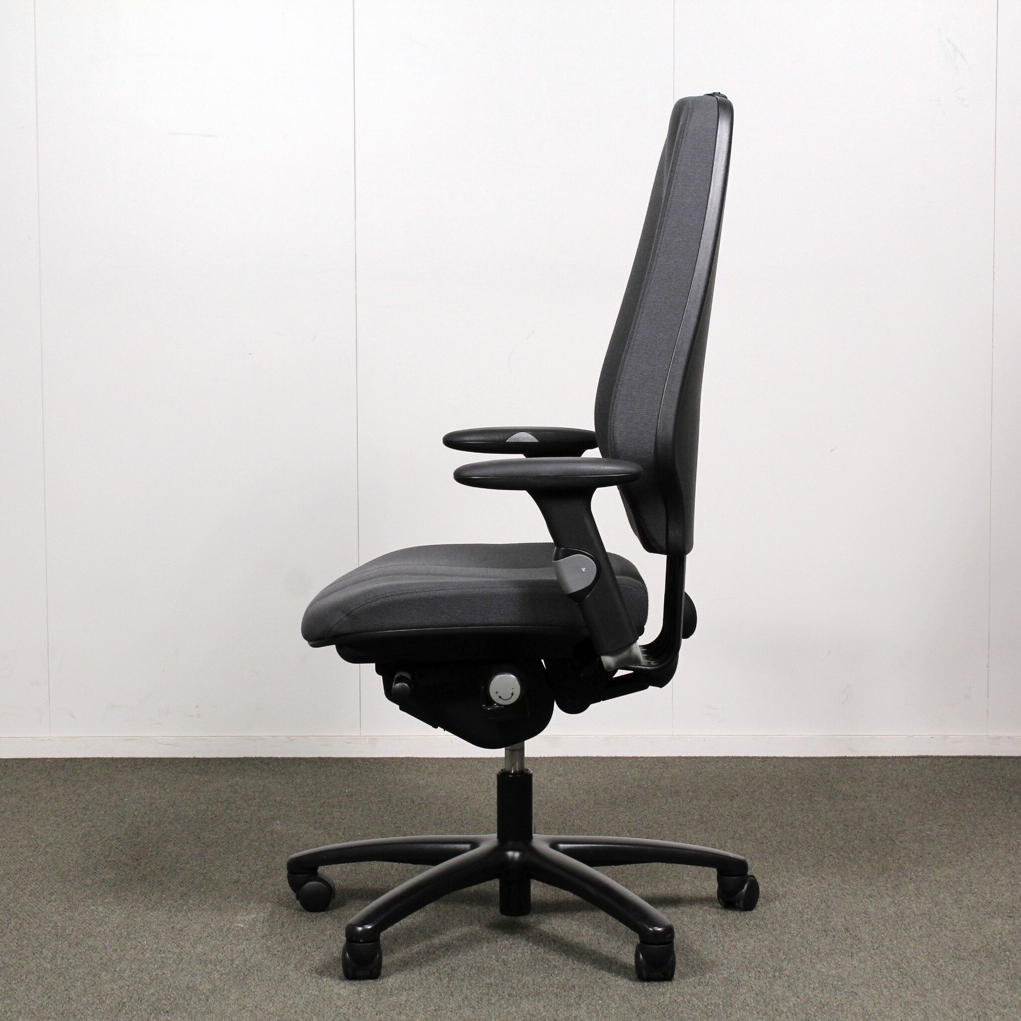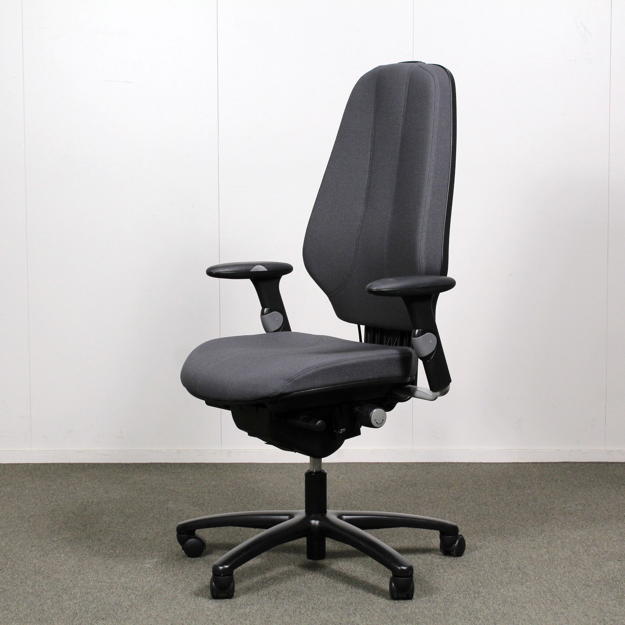 Säädöt: Istuimen korkeuden ja syvyyden säätö, istuimen ja selkänojan kallistuskulman säätö, selkänojan korkeuden säätö, keinu, käsinojat.