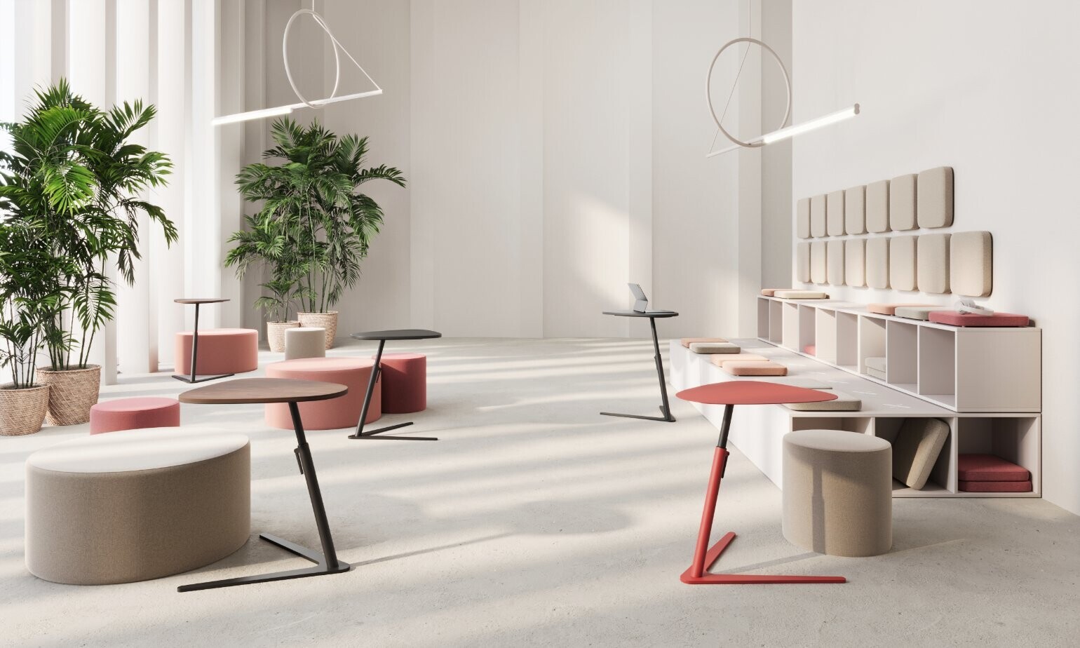Säädettävä korkeus. Jalusta ja kansi pulverimaalattua metallia, 8 vakioväriä.